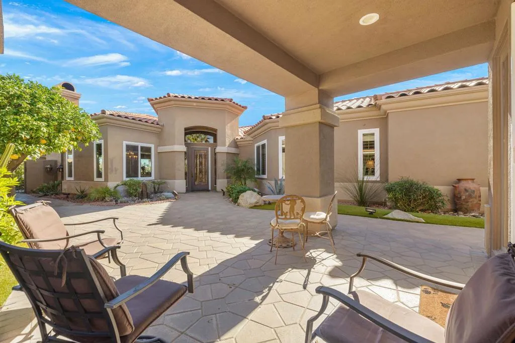 Set on an elevated lot, this sought-after Ocotillo 2 delivers sweeping views across three fairways, the driving range, and dramatic mountain backdrops spanning the Grove and Arroyo courses. Outdoor living shines with a generously sized, elevated patio finished with pavers, a fire pit, and a built-in BBQ perfect for entertaining or simply soaking in the scenery. The popular Ocotillo 2 floor plan features a light-filled great room where the living, dining, and family areas flow seamlessly to the patio, all oriented to capture the incredible views. Custom built-ins enhance both the living and family rooms, while a wet bar overlooks the outdoor living space. A formal dining room sits just off the entry, and the kitchen offers a breakfast bar that opens to the family room for easy entertaining. The primary suite offers a peaceful courtyard outlook and is complete with dual vanities, a soaking tub, a separate shower, and two closets--one a generous walk-in. Two additional ensuite guest rooms are located in the main house, with one currently styled as a home office with custom built-ins. A standout feature is the detached custom casita, privately positioned off the front courtyard. It includes a bedroom, bathroom, compact kitchenette, and its own laundry area ideal for guests or extended stays. Additional highlights include an attached two-car garage plus golf cart garage, furnishings offered per inventory, and a Club Membership available with no wait. Golf membership available per wait list.