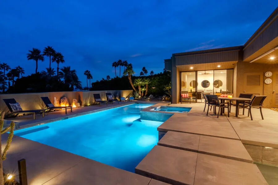 First time on the market 40 years! This modern residence in Chino Canyon's coveted Little Tuscany enclave is a serene oasis of privacy, showcasing sweeping valley and mountain views. Beautifully maintained and thoughtfully updated, the home features high ceilings, recessed lighting, smartly remodeled bathrooms, and a chef's kitchen designed for both daily living and effortless entertaining.Sleek porcelain tile floors flow seamlessly to expansive indoor-outdoor living and dining areas. Double doors open to a large covered patio and lushly landscaped west-facing yard, bask in the east-facing pool and spa and enjoy tranquil morning light and dramatic mountain backdrops. A generous Pebble Tec pool, spa, and gas fire pit create an inviting setting for relaxation and entertaining. Pool and spa feature newer equipment with both chlorine and optional saltwater filtration systems.The versatile floor plan offers two ensuite bedrooms, a third bedroom with adjacent bath, and a fourth office or bedroom with a built-in Murphy bed. The primary carpeted retreat is just steps from the pool and spa, enhancing the home's effortless indoor-outdoor lifestyle.The gourmet kitchen is outfitted with black granite countertops, a new six-burner Wi-Fi-controlled JennAir range, Sub-Zero refrigerator, Miele dishwasher, and a bar with built-in ice maker. A secondary caterer's kitchen located in the attached two-car garage further elevates the home's entertainer appeal.Practical luxuries include 64 owned solar panels across two systems with a Tesla backup battery, water softener, two central A/C units, two evaporative coolers, a silicone-protected foam roof, intercom electric secured entry gate, and security cameras.Perfectly designed for relaxed Palm Springs living, this Chino Canyon gem blends modern comfort, timeless appeal, and exceptional views in one of the city's most desirable neighborhoods.
