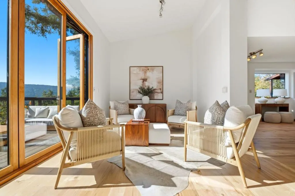 Welcome to a residence where artistry meets architecture. Set in Emerald Hills on an expansive view lot, the home was designed for those who value quality, creativity, and originality. From the custom iron gate by Burning Man artist Bryan Tedrick to the antique Santa Fe stained-glass entry window, every detail tells a story. Soaring ceilings and dual 7×20 folding glass doors dissolve boundaries between inside and out, opening to expansive decks with sweeping views. The chef's kitchen features a granite island, six-burner range with pot filler, oversized refrigerator, and custom cabinetry. The primary suite offers a spa-inspired granite bath with steam shower, soaking tub, walk-in closet, and gas fireplace. The lower level, once an art gallery, invites income potential or flexible living space with separate access. The grounds include terraced gardens, mature fruit trees, solar panels with EV charging, and cedar outbuildings ideal for a gym, studio, or retreat. Close to amenities, but it feels like a world away.