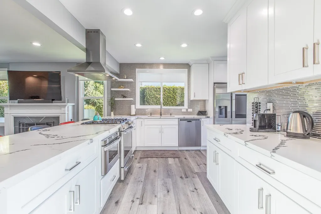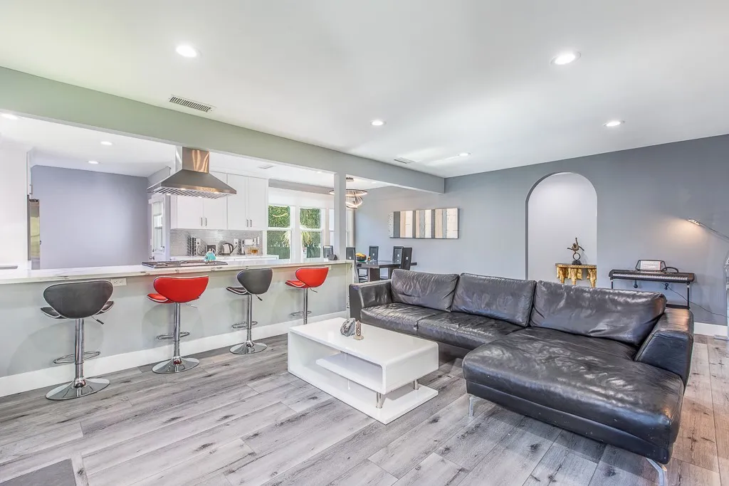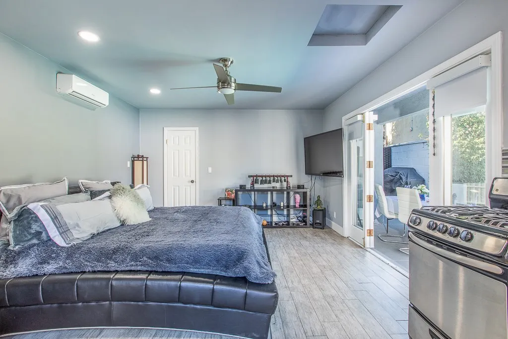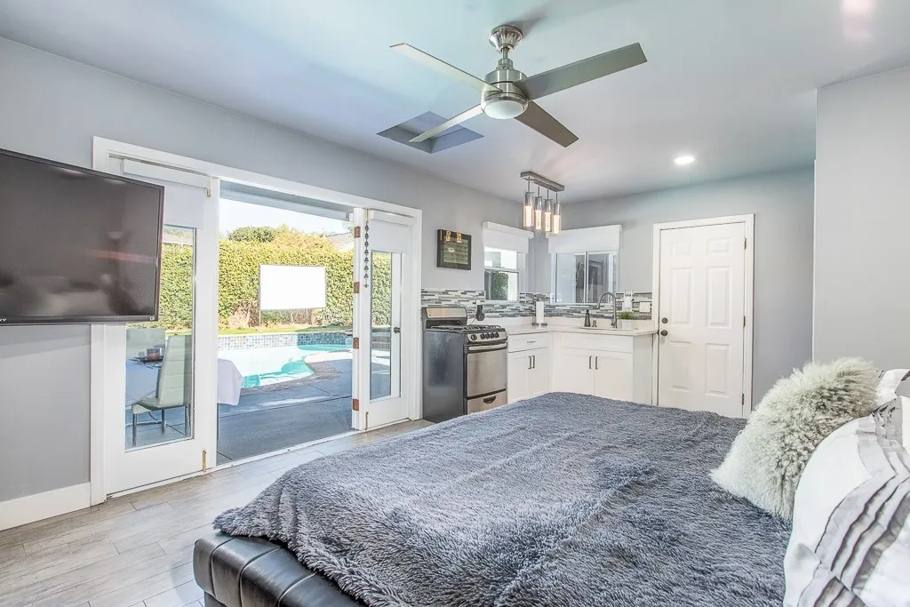 Rare offering in the heart of West Hollywood, set on a peaceful cul-de-sac. This exquisitely remodeled modern residence features a two-bedroom, two-bathroom main home with an open-concept floor plan and seamless indoor-outdoor flow to private front and rear gardens framed by mature greenery. Complementing the main residence is a distinctive, villa-style guesthouse offering a private living space with a full kitchen (gas cooking and refrigerator), an expansive spa-like bathroom, and dedicated storage—ideal for guests, a home office, or extended living. The property showcases a solar- and gas-heated saltwater pool with both indoor and outdoor Jacuzzis, creating an exceptional setting for refined living and entertaining. Fully paid electric solar panels and a dedicated solar pool heating system enhance energy efficiency. A true smart home, providing control of lighting, motorized window treatments, climate, pool and spa systems, door locks, TVs, and security (Ring doorbell and Arlo cameras) via smartphone or tablet. The chef’s kitchen is appointed with brand-new smart appliances, including one smart refrigerator and one smart oven, along with a built-in upscale microwave. Additional highlights include a gated driveway, ample street parking,