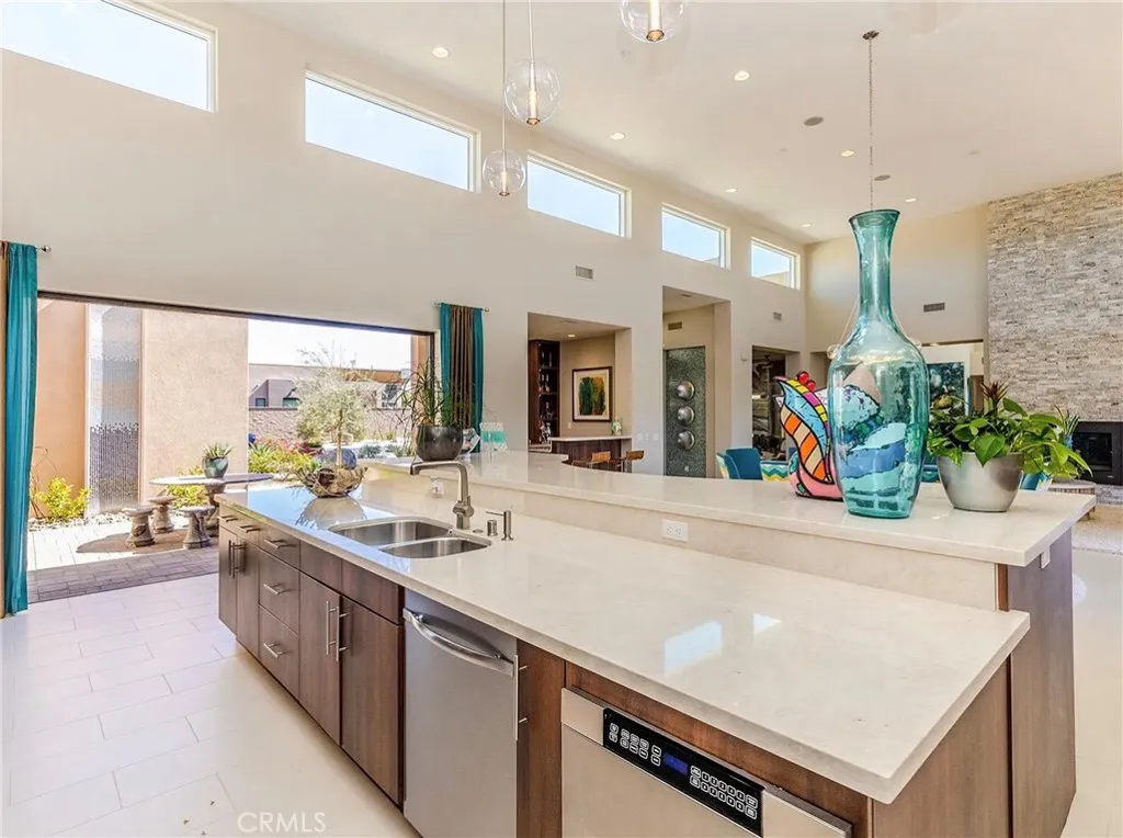 TOLL BROTHERS MODEL HOME | MODERN LUXURY IN ESTILO One of three original model homes by award-winning Toll Brothers, this exceptional residence behind the exclusive gates of Estilo showcases refined modern living with striking architectural detail throughout. Upon entry, soaring 16-foot ceilings, dramatic chandeliers, and walls of natural light create an immediate sense of grandeur. The open-concept great room is ideal for relaxation and entertaining, anchored by a statement stone fireplace and complemented by a full entertainer’s wet bar with ice maker, wine refrigerator, and high-end Control4 surround sound throughout the home. The gourmet kitchen is a chef’s dream, featuring an oversized marble-clad island, custom cabinetry, premium stainless steel Dacor appliances, and a spacious walk-in pantry—perfect for everyday living or hosting. Oversized pocket doors provide seamless indoor-outdoor flow, opening from the kitchen to a private courtyard and from the great room to the resort-style backyard. Here, an infinity-edge Pebble Tec pool and spa are flanked by dual fire features, with smartphone-controlled pool functions and misters creating a private oasis for year-round enjoyment. A dedicated media room offers a cinematic experience with a 70” television and wine refrigerator—ideal for movie nights or game days. Throughout the home, custom drapery, plantation shutters, and electric remote shades enhance both style and function. New carpet has recently been installed in the office, primary suite, and an additional bedroom. Guests will appreciate the attached one-bedroom, one-bath casita featuring its own living area, wine refrigerator, private patio, and separate outdoor speakers—an ideal retreat for visitors or extended stays. The primary suite is a serene sanctuary, highlighted by a designer textured accent wall, custom drapery, and a spa-inspired bath with dual marble vanities, custom cabinetry, an oversized jetted soaking tub, and a glass-enclosed shower with multiple individually controlled shower heads. The reimagined walk-in closet offers extensive custom shelving and thoughtful accessory storage. Additional highlights include two separate garages, an expansive paver-lined driveway, built-in garage cabinetry, overhead storage, and a tankless water heater. Professionally landscaped grounds feature individual drip irrigation for effortless beauty and efficiency. A rare opportunity to own a showcase Toll Brothers model home.