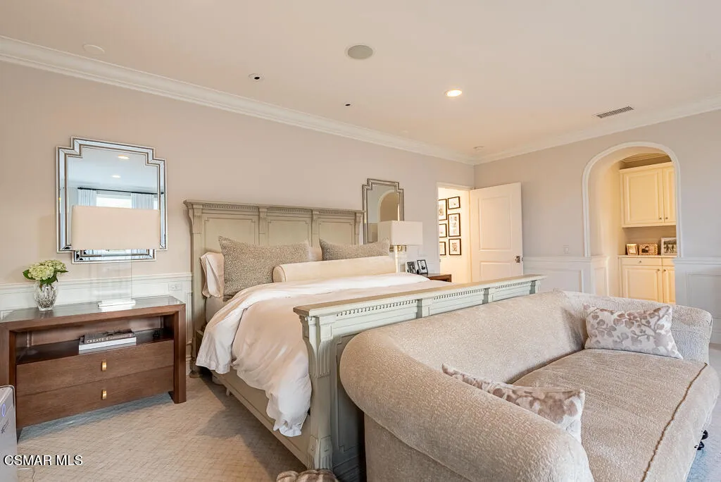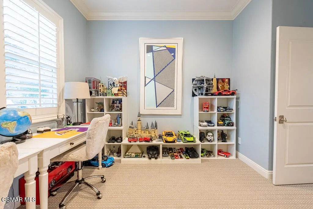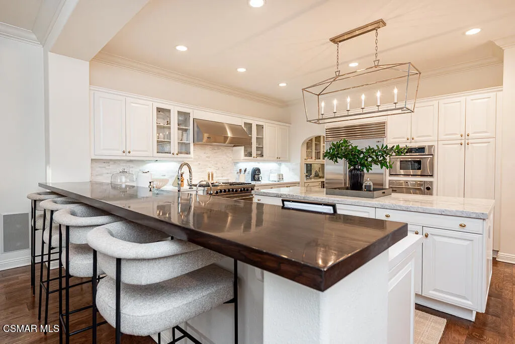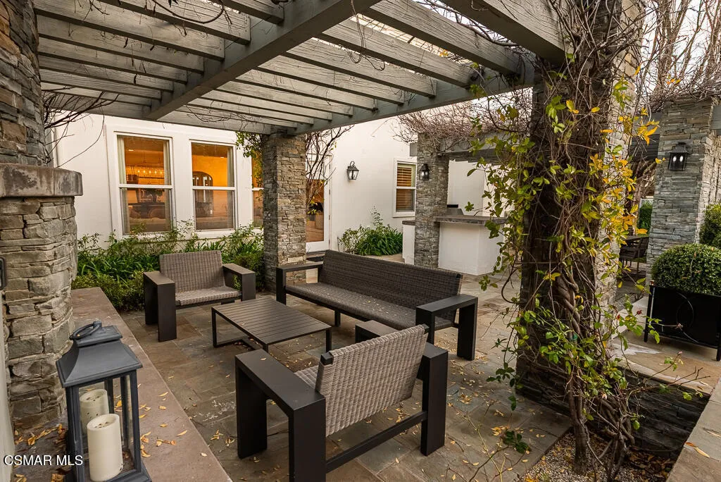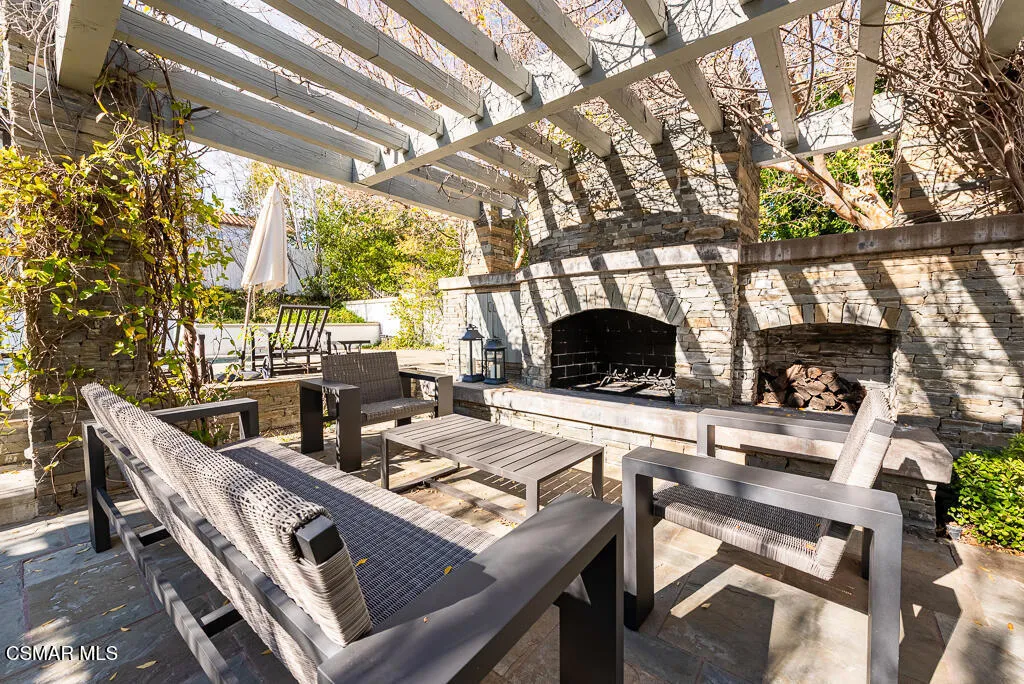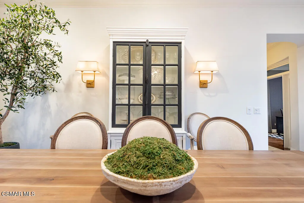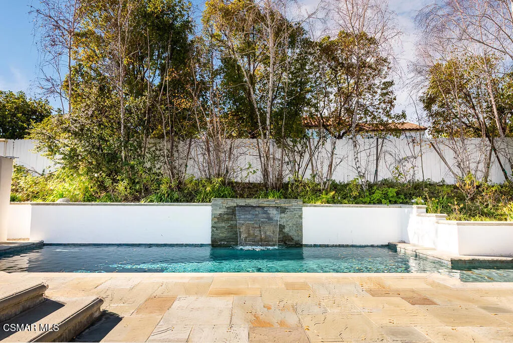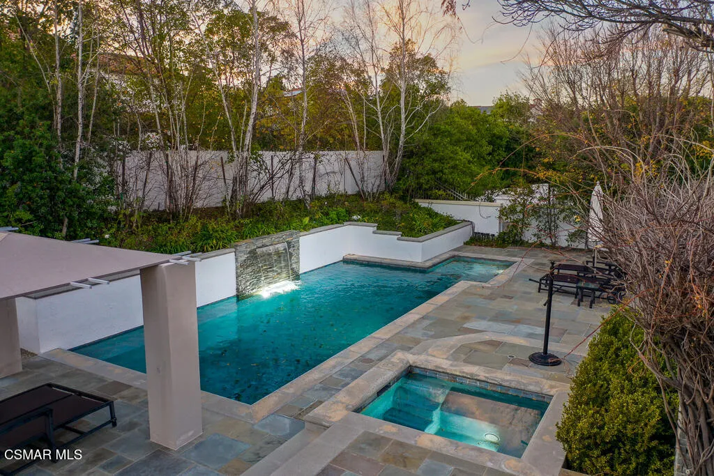 An East Coast-inspired traditional, beautifully designed for a glamorous Southern California summer.Dark wood floors and crisp white walls create a striking, gallery like backdrop for the home's bold, curated style. A formal living room and a gracious private office open to an intimate courtyard, setting a dramatic tone the moment you arrive. The formal dining room, framed by French doors, flows effortlessly to the patio and tranquil fountain, perfect for unforgettable dinners and celebrations.The all-white chef's kitchen is anchored by an oversized center island made for everything from champagne brunches to chef-guided dinner parties. A main-level en-suite bedroom and a fireplace-warmed family room open to the backyard, creating seamless indoor-outdoor living.Upstairs, a lounge area joins four bedrooms, including a show-stopping primary suite with its own fireplace and a newly remodeled gray-marble spa bath, your private retreat at the end of every day.Outside, the resort experience continues with a pool and spa, outdoor fireplace and lounge areas, built-in BBQ, and a half court, every space designed for entertaining, relaxing, and living beautifully.Set behind the gates of The Oaks of Calabasas, this residence offers a rare opportunity to enjoy one of Southern California's most sought-after private communities, known for its privacy, sense of neighborhood, and effortless access to Calabasas' celebrated dining and shopping, as well as Malibu's beaches and Beverly Hills.This isn't just a home. It's a five-star summer in one of the most coveted enclaves in the Valley.