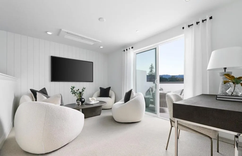 Consistently listed among the county's most desirable places to live, Saratoga is the setting for the Elms, a boutique community of new construction townhomes style condos. The Elms beautiful plan 2 home has solar purchase included and offers gorgeous high ceilings with open living area, and gourmet kitchen with quartz countertops, chef kitchen package, Stainless-steel appliances, upgraded cabinets, and beautiful luxury vinyl plank flooring throughout living areas. All design options have been selected for this home by our professional Designer. Spend time with friends and family or just relax upstairs in the open gathering room, kitchen, and cafe. At the end of the day, enjoy quiet solitude on the top-level mezzanine with indoor/outdoor living. Pictures are of model home not the actual home.