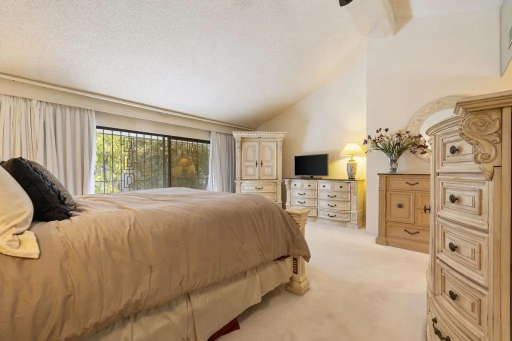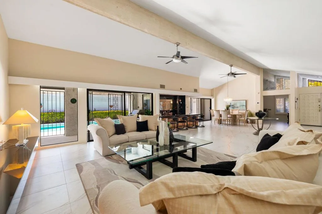 Located in the prestigious Indian Canyons neighborhood of South Palm Springs one of the desert's most exclusive and enduring addresses this residence offers a rare opportunity to own in a truly iconic setting. Situated on fee simple land (you own it), the home welcomes you through double entry doors into a dramatic interior featuring soaring vaulted ceilings with exposed beams and an open, light-filled layout designed for effortless entertaining. The living and dining areas are centered around a fireplace and step-down wet bar, while three spacious ensuite bedrooms provide comfort and privacy. The versatile third bedroom or den includes a private entrance and stunning mountain viewsAa'ideal for guests, a home office, or studio space. The kitchen features granite countertops with mountain backdrops, and direct access to the attached two-car garage. Outdoors, the south-facing backyard delivers all-day sunshine and unobstructed views of the San Jacinto Mountains. The resort-inspired grounds include an oversized pool with decorative tile, spa, swim-up bar with seating, built-in outdoor kitchen, and mature citrus trees creating a true Palm Springs sanctuary. With timeless architecture and an exceptional setting, this home awaits your vision, and finishing touches an opportunity to elevate a classic into a personalized luxury retreat in one of Palm Springs' most coveted neighborhoods.