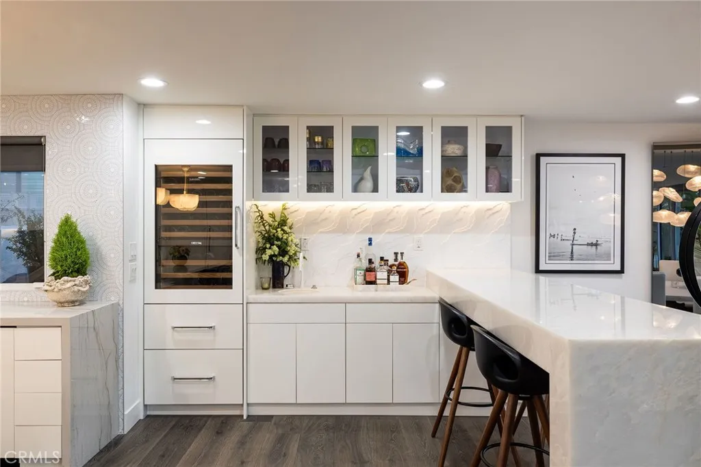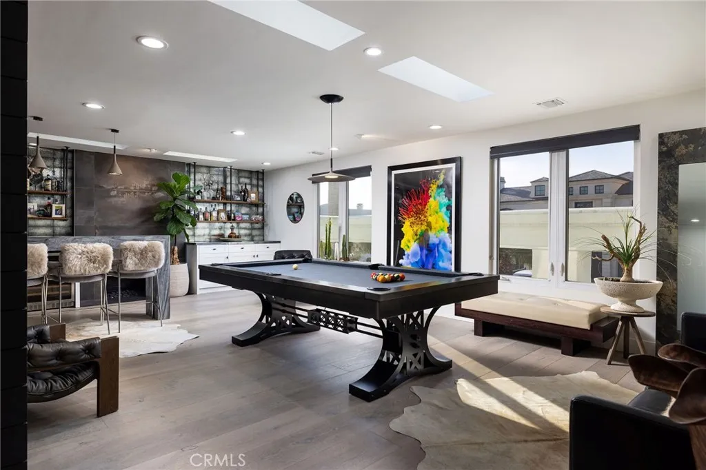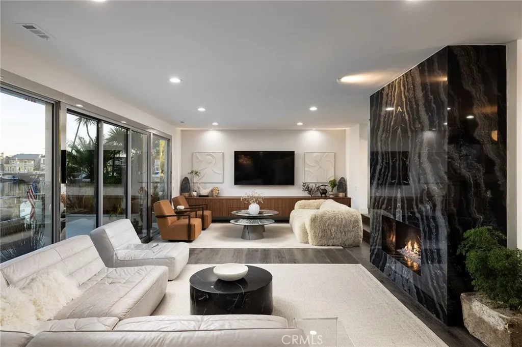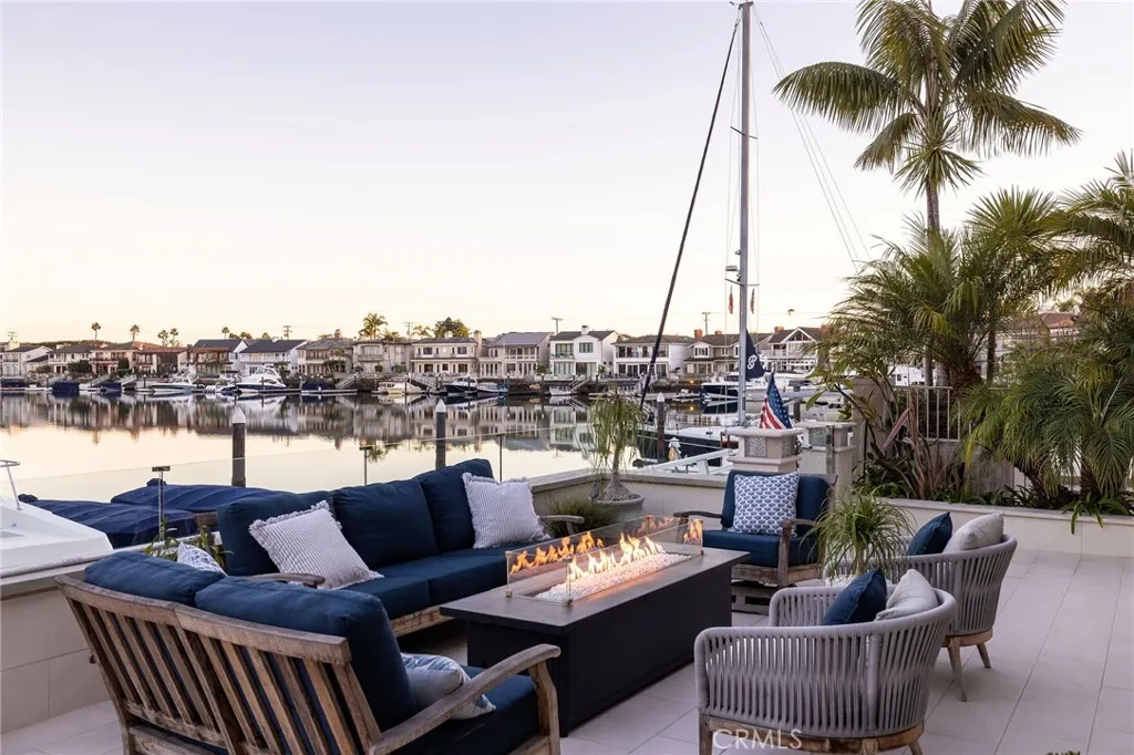 Shimmering water vistas, contemporary architecture, and bespoke interiors define this extraordinary waterfront residence. Approximately 53 feet of water frontage and a private 40-foot dock anchor a bayfront deck designed for effortless entertaining, complete with an in-ground spa and expansive outdoor living space. Design-forward living is evident upon arrival, introduced by newly installed custom tinted garage doors with walnut frames and a custom walnut-and-glass pivot front door with matching gate. Spanning approximately 4,440 square feet, the thoughtfully designed floor plan offers four en suite bedrooms and four-and-one-half baths, including a main-level suite ideal for guests or multigenerational living. A dramatic foyer sets the tone with double-height ceilings, a floating staircase accented by custom stainless steel railings, and floor-to-ceiling windows sandblasted for privacy. Wide-plank wood floors and a sculptural Tom Dixon light fixture elevate the sense of arrival. Main living spaces center around a book-matched granite fireplace, where expansive sliding glass doors frame views of the boat-dotted harbor beyond. Indoor-outdoor flow continues into a waterfront dining room anchored by a statement Bocci chandelier crafted from hand-blown glass. Culinary pursuits are elevated in a custom gourmet kitchen featuring waterfall-edge onyx countertops, bespoke cabinetry, a wet bar, Wolf range, built-in Sub-Zero refrigeration, high-top seating, and a Sub-Zero wine cooler. Two staircases lead to the upper level, where three en suite bedrooms are complemented by a fireplace-warmed bonus or game room with wet bar and a secondary laundry room. Retreat-like privacy defines the primary suite, showcasing Promontory Bay views from a private balcony, mirrored wardrobe walls, a freestanding soaking tub, separate shower, and refined Foscarini lighting. Additional highlights include skylights, curated Restoration Hardware lighting, specialty tile from Artistic Tile and TileBar, floating built-in cabinetry, a Murphy bed in one bedroom, solar-assisted air conditioning, an alarm system with video surveillance, and an attached three-car garage. Ideally positioned moments from Lido Marina Village, Fashion Island, world-class resorts, and award-winning schools, this waterfront estate offers a rare connection to Newport Beach’s most coveted coastal lifestyle.