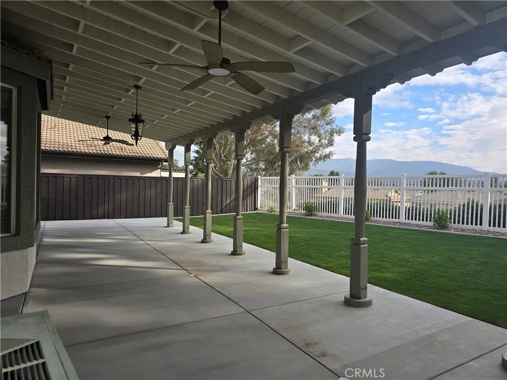 The backyard is designed for relaxation and entertaining, featuring a full-length custom patio cover and panoramic mountain views.
