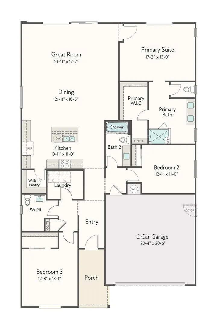 Inside, the Palomar Plan 1 features a bright, open-concept layout designed for both comfort and functionality. The spacious living area flows seamlessly into the dining space and kitchen, creating an ideal setting for everyday living and entertaining. The kitchen is thoughtfully designed as the heart of the home, featuring stylish quartz countertops, ample cabinetry, and a layout that opens directly to the main living areas. An attached two-car garage adds convenience and additional storage.