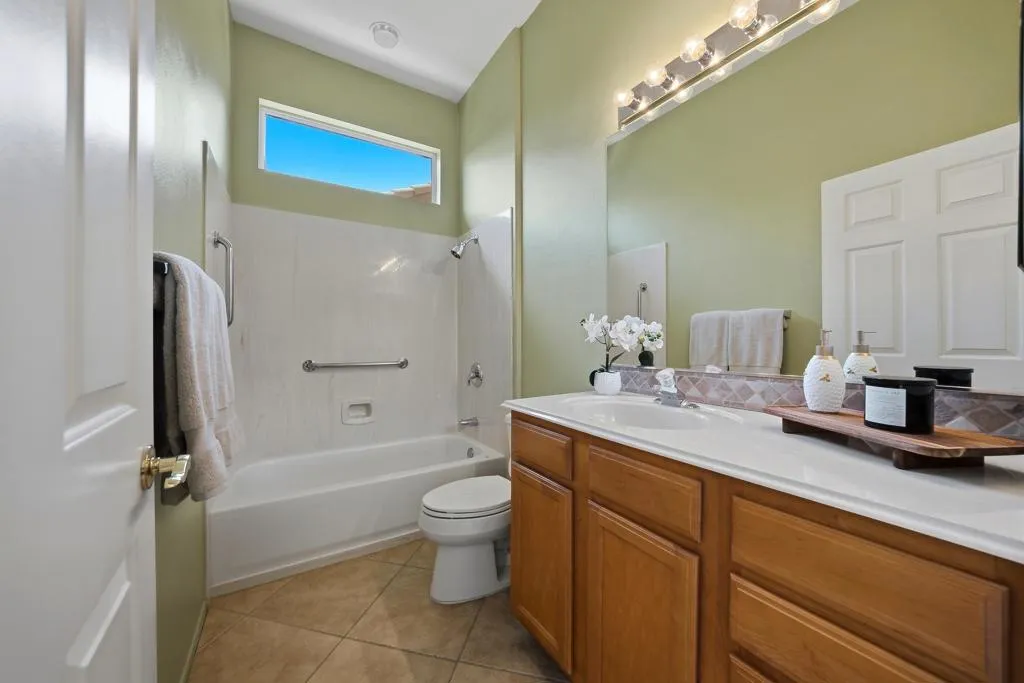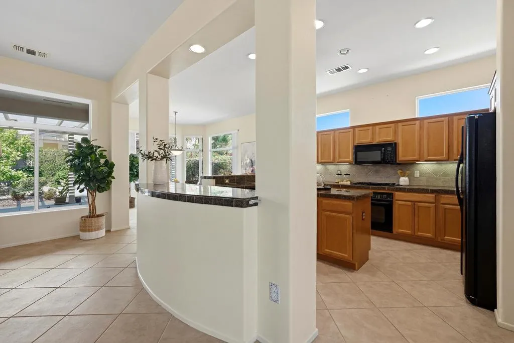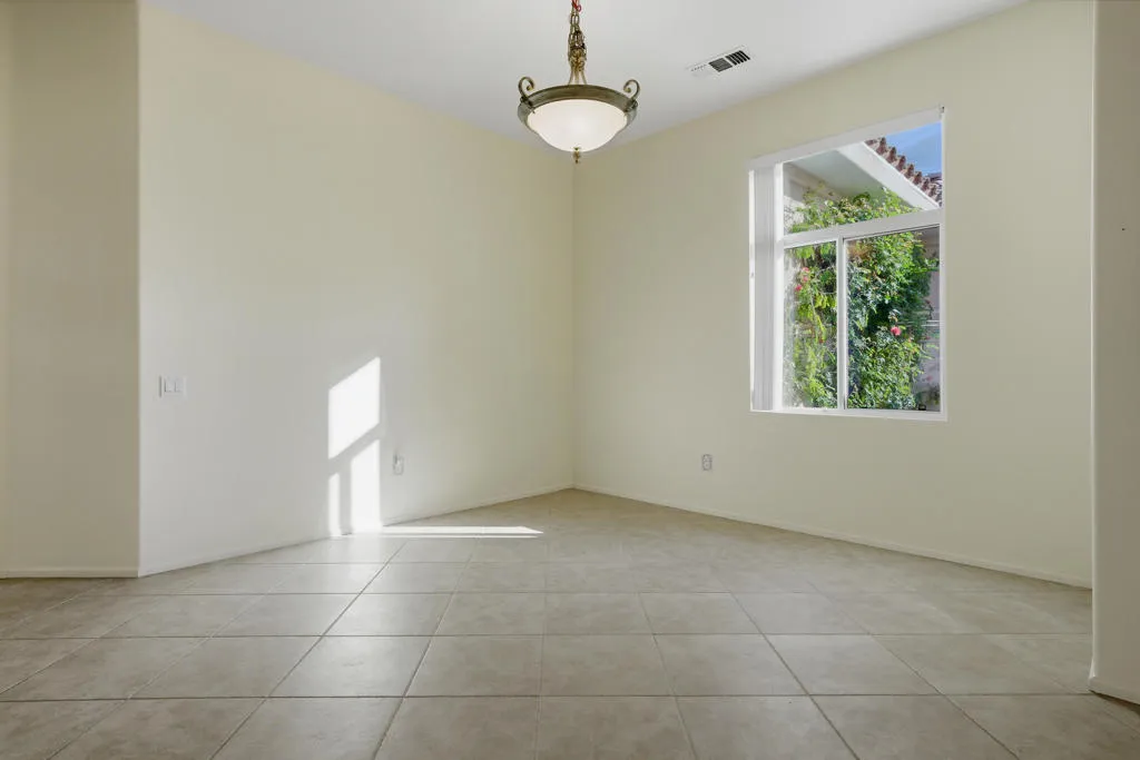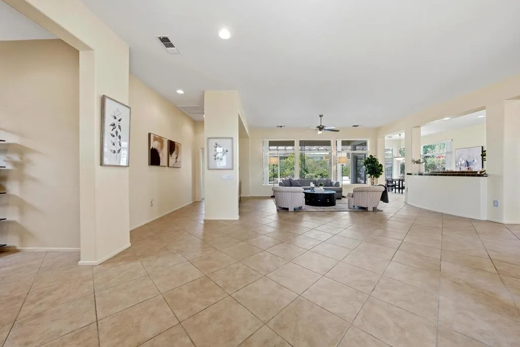 Sun City Palm Desert - Monterey. Ideally located just a short distance from the Lakeview Recreation Center and the Sunset View Clubhouse, this lightly used greatroom home offers comfortable indoor living and inviting outdoor space. The spacious rear yard features an extended patio with sitting walls, an alumawood patio cover, and lush desert landscaping--perfect for relaxing or entertaining. A gated front courtyard adds both curb appeal and functionality. Inside, 18-inch diagonally laid tile runs throughout, complemented by 10-foot ceilings and transom windows that create a bright, open atmosphere. The greatroom enjoys views of the rear yard and flows seamlessly into the kitchen, which features recessed lighting, granite countertops, under-cabinet lighting, and cabinetry with pull-out shelves. A spacious den/office is conveniently located off the greatroom. The primary suite includes a sliding door to the rear patio, a large walk-in closet, and an ensuite bath with tile mosaic flooring, a glass-enclosed stall shower, oversized soaking tub, and dual-sink vanity. The guest suite offers a mirrored wardrobe closet and an adjacent bath with a shower/tub combination. Additional features include a powder room with pedestal sink, a laundry room with storage and utility sink, and an extended 2+ golf cart garage with ample storage space. Recent updates include a new water heater (2017) and HVAC system (2019).