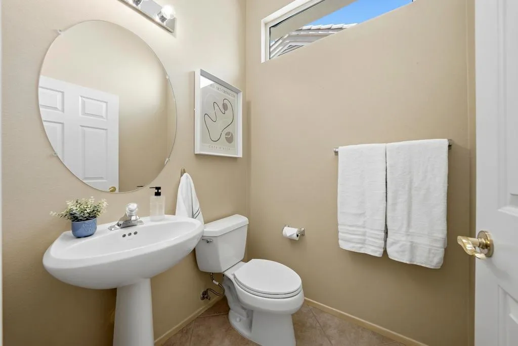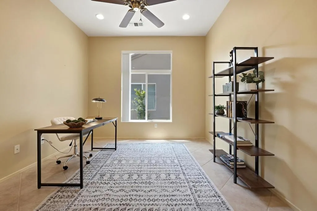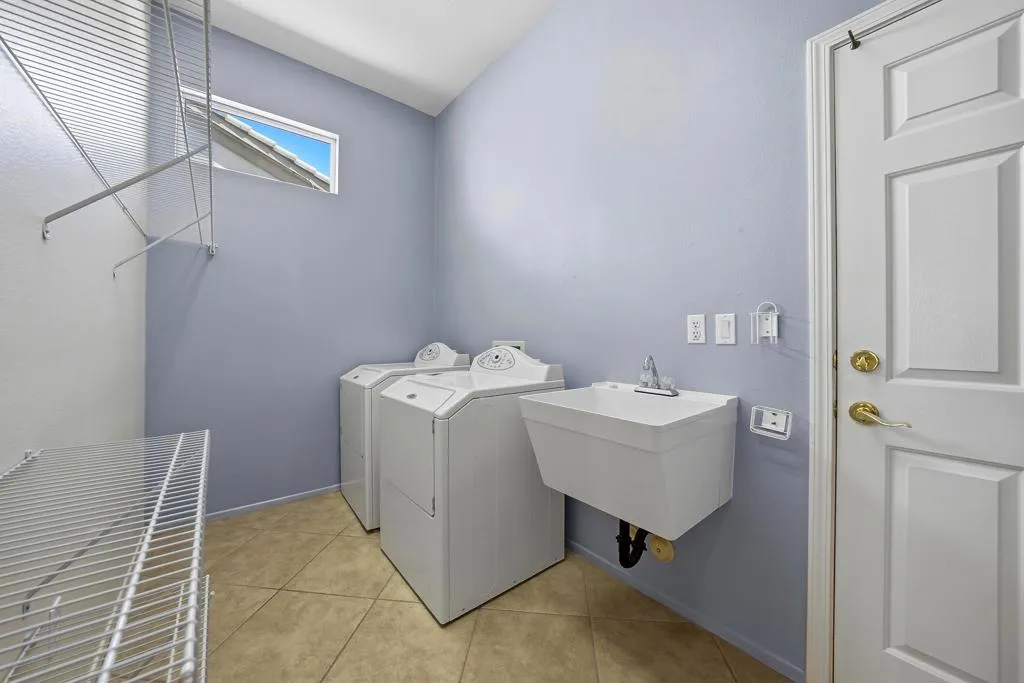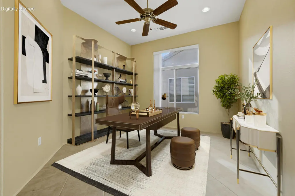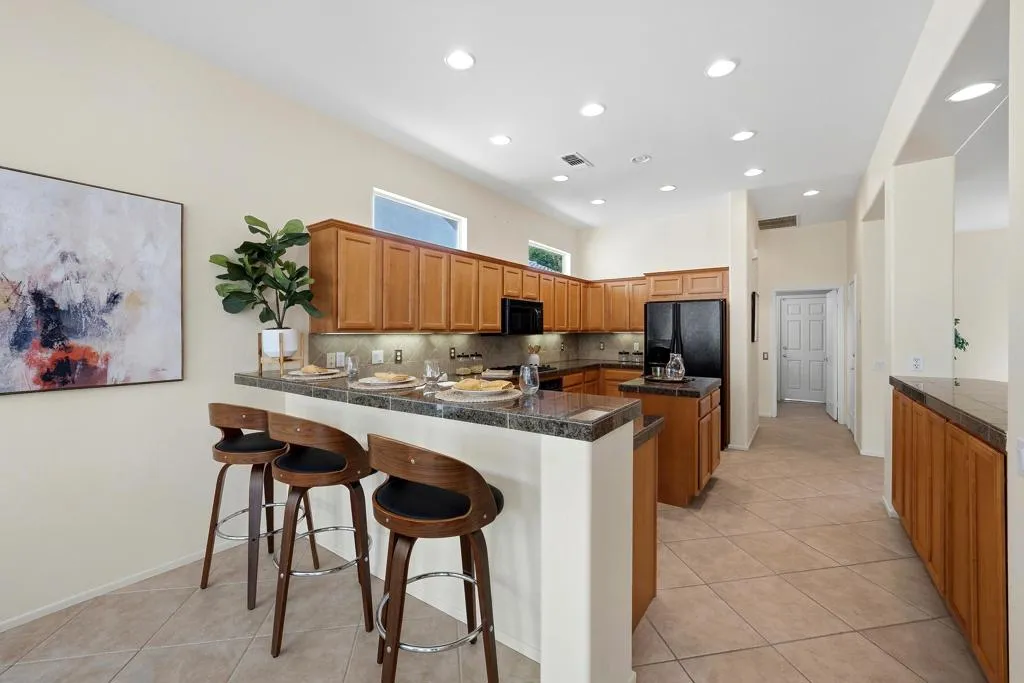 Sun City Palm Desert - Monterey. Ideally located just a short distance from the Lakeview Recreation Center and the Sunset View Clubhouse, this lightly used greatroom home offers comfortable indoor living and inviting outdoor space. The spacious rear yard features an extended patio with sitting walls, an alumawood patio cover, and lush desert landscaping--perfect for relaxing or entertaining. A gated front courtyard adds both curb appeal and functionality. Inside, 18-inch diagonally laid tile runs throughout, complemented by 10-foot ceilings and transom windows that create a bright, open atmosphere. The greatroom enjoys views of the rear yard and flows seamlessly into the kitchen, which features recessed lighting, granite countertops, under-cabinet lighting, and cabinetry with pull-out shelves. A spacious den/office is conveniently located off the greatroom. The primary suite includes a sliding door to the rear patio, a large walk-in closet, and an ensuite bath with tile mosaic flooring, a glass-enclosed stall shower, oversized soaking tub, and dual-sink vanity. The guest suite offers a mirrored wardrobe closet and an adjacent bath with a shower/tub combination. Additional features include a powder room with pedestal sink, a laundry room with storage and utility sink, and an extended 2+ golf cart garage with ample storage space. Recent updates include a new water heater (2017) and HVAC system (2019).