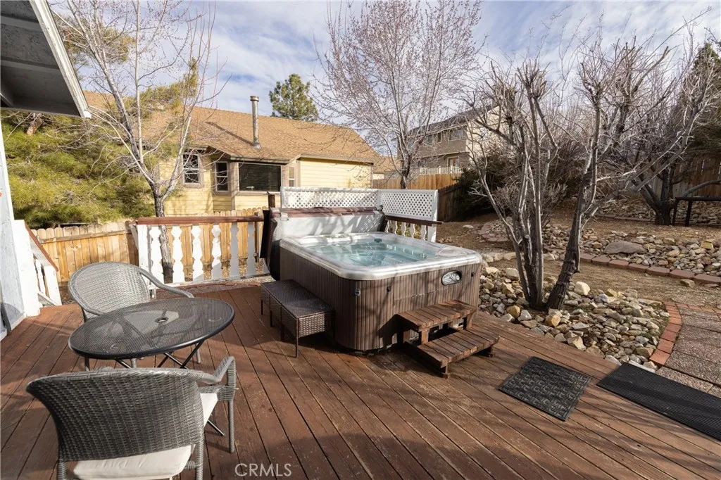 Located near the desirable Maple Ridge area, this fully furnished 3-bedroom, 2.25-bath mountain home offers a rare combination of comfort, functionality, and year-round accessibility with City Snow-Plow service. The light-filled interior features an inviting layout with multiple gathering spaces, while the spacious primary suite includes vaulted ceilings, dual walk-in closets, and a private balcony with mountain views. Tastefully updated kitchens, bathrooms and a cozy fireplace. Outdoor amenities include a Private Hot Tub and a large backyard with mature fruit trees, including three types of apple trees, a pear tree, and a sugar plum tree, creating a unique mountain setting. Additional features include an oversized Attached 2 Car Garage and RV Parking. Conveniently located near Bear Mountain Ski Resort, golf course, hiking trails, the zoo, and local shopping and dining. Ideal for full-time living, second home use, or vacation rental (buyer to verify with local regulations).