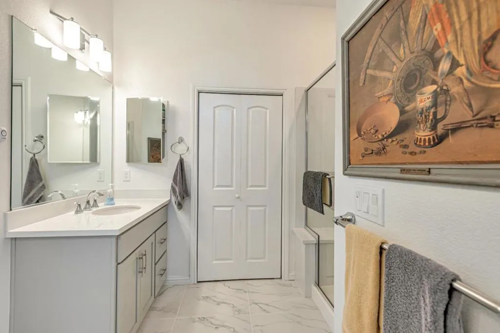 This remarkable single-level condominium offers nearly 1,800 square feet of well-designed living space. The residence includes three generously sized bedrooms and three full bathrooms, featuring two elegant ensuite arrangements. Throughout the home, high ceilings contribute to an open and expansive ambiance, while individual ductless heating and air conditioning units in each room ensure optimal comfort for every resident. The contemporary kitchen is appointed with sophisticated gray shaker cabinetry, complemented by stone gray and white countertops for a polished aesthetic. Seamlessly integrated into the adjoining dining area and living room, the layout is ideal for hosting gatherings. The expansive breakfast bar enhances both the utility and appeal of the space, offering additional seating and serving options. Notable amenities include a rooftop entertainment area for social engagement and relaxation, as well as an elevator for effortless movement within the building. Additional conveniences consist of an in-unit laundry closet, and a two-car garage, complete with ample storage space.