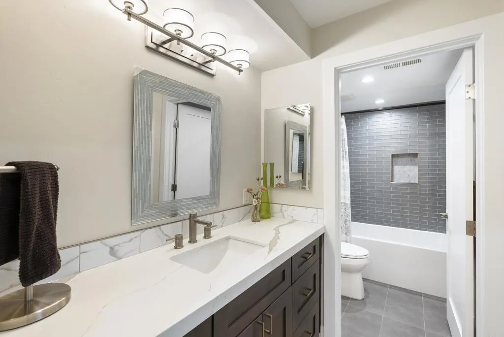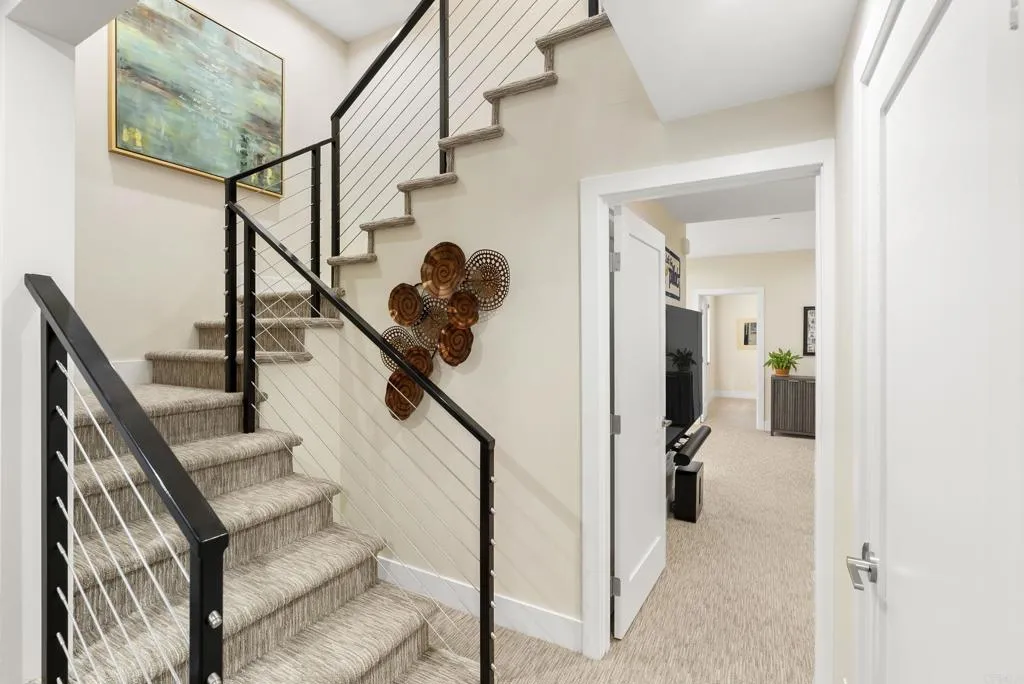Bring your toothbrush, surfboard, and beach towel! This turnkey, move-in ready luxury coastal home, set on one of Cardiff-by-the-Sea’s most sought-after and walkable streets, offers breathtaking panoramic ocean views from its private rooftop deck, effortless indoor–outdoor living, and a level of thoughtful luxury upgrading rarely found in a coastal home of this scale. Meticulously refreshed with a focus on design, comfort, sophisticated modern finishes, and long-term livability. The main living spaces feature wide-plank European Oak engineered hardwood flooring imported from Spain, creating a warm, modern foundation for everyday coastal living. Bedrooms and additional flex spaces (ideal for home office, kids’ rooms or guests) are newly carpeted, while fresh interior paint, new molding and trim, and curated lighting elevate the home’s clean, contemporary aesthetic. At the heart of the home, the chef-inspired gourmet kitchen has been fully upgraded with a suite of premium black stainless Bosch 800 Series appliances, including an induction range, dishwasher, and refrigerator, complemented by a Z-line microwave drawer, new plumbing fixture, custom pantry/coffee bar, and updated cabinet hardware throughout. A former soffit and fan were removed to open the kitchen, creating unobstructed sight lines—so you can enjoy ocean views even while cooking or hosting. The expansive great room flows seamlessly to the deck through bi-fold doors, creating a true indoor–outdoor experience ideal for effortless coastal California living. Upstairs, a full rooftop deck with a built-in outdoor kitchen offers a rare, elevated entertainer’s dream space with stunning panoramic views—perfect for sunset dinners, al fresco gatherings, or morning coffee overlooking the Pacific. The spacious primary suite has been enhanced with a custom closet system, ceiling fan, and new blinds, including voice-controlled electric blinds for effortless comfort and privacy. There is a full-size laundry room, abundant built-in storage throughout—plenty of room for surfboards, bikes, and all your active lifestyle gear—and a host of smart-home features: a SimpliSafe security system with doorbell and three cameras, a Wi-Fi–enabled garage keypad, and an upgraded electrical panel ready for Level 2 EV charging (240V). Outdoors, new plantings with drip irrigation enhance the property’s curb appeal while maintaining easy low maintenance. A paved alley leads to a usable two-car garage plus parking for up to 4 additional cars—an incredibly rare feature in this highly desirable beach-close enclave. Beyond its current beauty, this home delivers exceptional future flexibility and long-term value. The lower floor was built to allow for future conversion to an income-producing Accessory Dwelling Unit (ADU)—opening the door for short- or long-term rental income, guest accommodations, multi-generational living, or a private executive office space (ideal for remote work, creative pursuits, or a personal yoga/gym retreat to match your active lifestyle). What truly sets this home apart is its incredible lifestyle: Stunning ocean views. Exceptional walkability to the beach, shops, cafés, and restaurants. A true great room layout opening to the deck. A full rooftop entertaining level. Abundant storage rarely found in a home of this size. And a location that puts Cardiff’s beaches, shops, cafés, and coastal energy just moments away. Ideal as your primary home for an active coastal lifestyle or as a turnkey second home and coastal retreat—this is not just a home—it’s an ideal vantage point for living the ultimate Cardiff-by-the-Sea lifestyle.