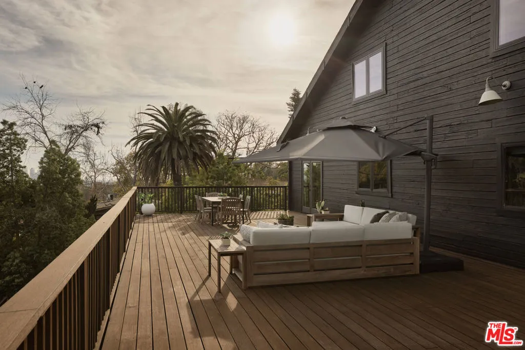 Set on one of the coveted flat streets in the hills of Elysian Heights, this modern A-frame inspired residence offers striking architecture, thoughtful design, and an exceptional sense of space across a light-filled foot floor plan. Soaring ceilings, warm materials, and curated finishes create a seamless balance of rustic charm and modern convenience.Upon arrival, a welcoming entry and oversized mudroom establish a sense of flow and intention. The main living areas unfold into an expansive great room where vaulted tongue-and-groove ceilings, clerestory windows, and a gas fireplace set a warm yet dramatic backdrop. The kitchen is both streamlined and expressive, outfitted with integrated appliances, open shelving, custom lighting, abundant storage, and connects naturally to an intimate den perfect for casual evenings or quiet mornings. Natural light pours throughout the 4-bedroom, 3-bath home via multiple skylights. The main level also includes a bedroom, full bath, and laundry area. Public spaces extend outdoors to an expansive 1,800+ square-foot refinished deck overlooking treetops, rolling hillsides, Downtown Los Angeles views, and a resort-style saltwater pool, spa, and fire pit ideal for entertaining or unwinding in total privacy. Upstairs, the serene primary suite offers dual closets and a beautifully designed bathroom with a soaking tub, walk-in shower, and dual-sink vanity. Two additional bedrooms and a full bathroom complete the second level. A detached office/gym provides a quiet, private space for work or creative pursuits. Meticulously updated interiors showcase designer finishes, custom millwork, and thoughtful details throughout. Updated systems and solar panels complete the offering. Ideally situated in Echo Park, just steps from the outdoors and moments from neighborhood favorites, Sunset Boulevard, and Silver Lake, this home delivers inspired design, effortless indoor-outdoor living, and a true urban hillside escape.