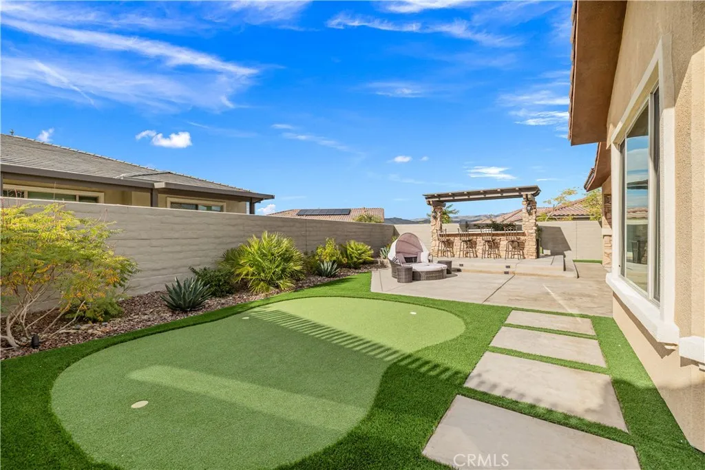 Step outside to a resort-style outdoor oasis crafted for both relaxation and entertaining. The enclosed patio with porcelain tile flooring flows seamlessly to a custom outdoor kitchen with stone finishes, built-in grill, countertop, and pergola. A custom concrete patio with illuminated steps, a 3-hole putting green, and artificial turf in both the front and back yards create a low-maintenance yet luxurious environment. An outdoor stone entertainment wall, designed to match the grill area, completes this exceptional space.