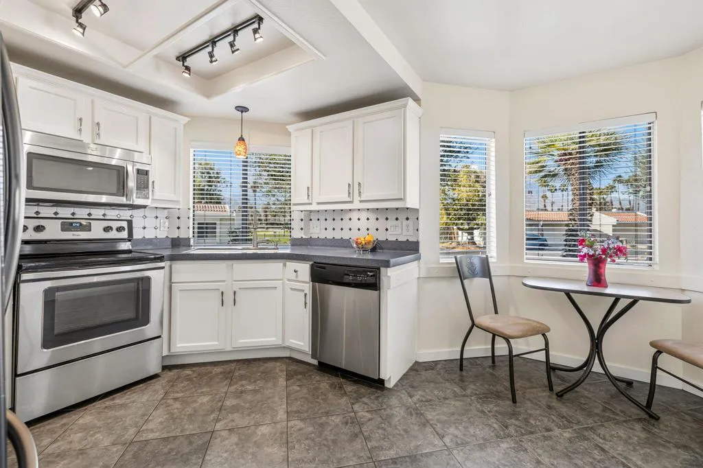 Fully remodeled. Completely furnished. Effortlessly turn-key.From dishes and glassware to furniture and decor--everything is included. Just bring your toothbrush and start living. Welcome to Cathedral Canyon Country Club, a coveted gated enclave offering true resort-style living with an 18-hole golf course, tennis courts, multiple sparkling pools, clubhouse amenities, and beautifully manicured grounds. This light-filled corner residence is wrapped in windows, creating a bright, airy atmosphere throughout. The thoughtfully designed 2-bedroom, 2-bath layout also features a versatile bonus space--perfect as a home office, den, or convertible third sleeping area. Soaring 13-foot vaulted ceilings elevate the open-concept living space, delivering volume, flow, and architectural drama. The home has been extensively upgraded with new flooring, fresh interior paint, upgraded stainless steel appliances, and two fully remodeled bathrooms, including a stunning primary en-suite. The kitchen opens seamlessly to the dining and living areas, ideal for relaxed everyday living or entertaining with ease. Step outside to the oversized west-facing patio and soak in panoramic mountain views, glowing desert sunsets, and direct access to the pool--just steps away. This is indoor-outdoor living at its best. Additional highlights include an insulated and updated two-car garage with built-in storage, an energy-efficient HVAC system less than five years old, premium window treatments, and newer appliances throughout. Meticulously maintained and move-in ready, pride of ownership is evident in every detail. Residents enjoy lush, reseeded fairways, serene walking paths, and unbeatable proximity to downtown Palm Springs, El Paseo, the airport, shopping, dining, and entertainment. Corner unit. Steps to the pool. Incredible sunsets. A perfect full-time residence, vacation retreat, or investment opportunity--this is resort living, done right.