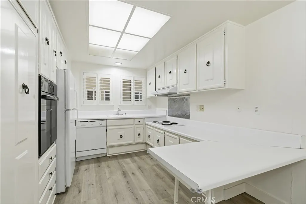 55+ community. Upstairs two bedroom two bathroom "Casa Contenta" model in a quiet greenbelt location of Laguna Woods Village, a short walk from both the carport and Aliso Creek. The building is surrounded by lawn and mature trees and has no one living above. Inside you will find fresh white walls, wood look plank flooring and a comfortable living and dining area that opens to a large covered balcony with pretty treetop and distant mountain views. The kitchen sits next to the dining area and offers plenty of cabinet and counter space, an electric cooktop, wall oven, dishwasher and refrigerator, plus a convenient breakfast counter that can double as a serving bar. Both bedrooms are good sized with excellent closet storage, and one bedroom also opens directly to the balcony. The hall bathroom features a tub and shower combination, and the primary suite has a step in shower, along with a dressing area and additional storage. Monthly rent includes HOA dues, water, sewer, trash and basic cable. Tenant pays the HOA processing fee of 160 dollars. Laguna Woods Village is a 55 plus active senior community where the first resident must be 55 or older and a second resident can be 45 or older, with clubhouses, pools, golf, fitness centers, transportation and hundreds of clubs and activities, all close to shopping, medical services and Laguna Beach.
