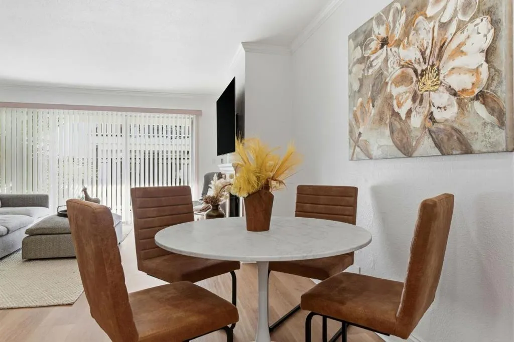 Beautifully updated condo in a prime location! This first-floor unit is situated in a secure building and offers a fantastic open floor plan. The spacious 2-bedroom, 2-bath layout features a large living area ideal for relaxing, dining, or working from home. A large sliding glass door opens to the expansive pool deck, flooding the space with abundant natural light. The updated kitchen boasts quartz countertops, modern cabinetry, a sleek sink, glass tile accents, updated lighting, and stainless steel appliances. Natural wood-tone flooring throughout the home creates a fresh, contemporary feel, while a cozy fireplace adds warmth and charm for cooler evenings. Additional highlights include three walk-in closets, gated underground parking with convenient access to the unit, and a walk-in storage room in the garage. Residents enjoy community amenities including four fenced swimming pools and two tennis courts. HOA dues cover water, gas, garbage, and exterior maintenance. Ideally located near downtown Mountain View with easy access to Highway 101, 85, and El Camino Real. Welcome home!