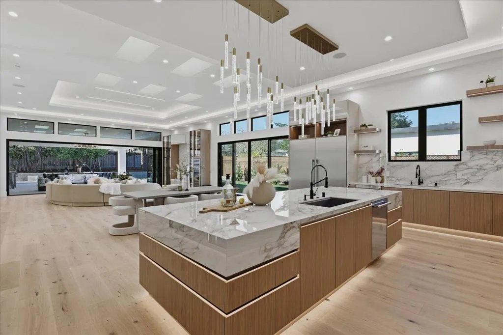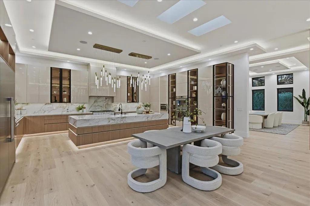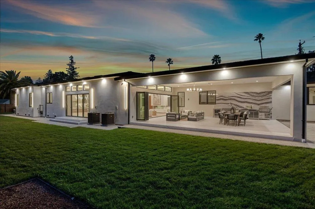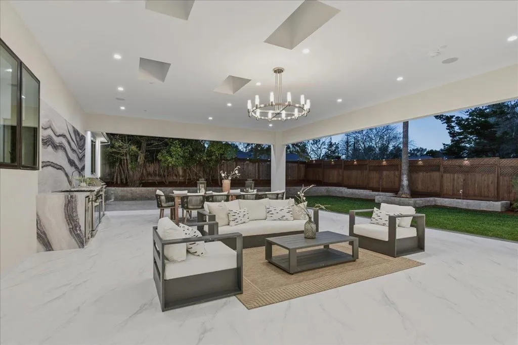 Experience this rare 2026 Brand-New Construction, a contemporary-modern masterpiece nestled on a tranquil, no-through private road in Saratoga's prestigious Golden Platinum on over a flat half of an acre w/unrivaled design. An impressive pivot door opens to a grand foyer w/cascading chandeliers, soaring 12-14 ft. ceilings & a seamless single-level floorplan finished w/European Oak flooring. The culinary kitchen dazzles w/custom European cabinetry, a Porcelanosa island & Thermador appliances. A DaVinci floating-island fireplace anchors the great room, where formal living & dining spaces are framed by designer accent walls. The layout features 5 ensuite bedrooms, w/floor-to-ceiling porcelain slabs, including a tranquil primary wing & an attached ADU integrated into the layout. The 850+ SF California Room w/full kitchen merges to the interior via glass bifold doors for lavish indoor-outdoor living. The grounds feature low maintenance Belgard pavers*lush grass*stones & a serene fountain. High-tech sustainability includes dual EV chargers*owned solar w/battery backups*audio zones*security cameras & whole house water filtration system-A Silicon Valley sanctuary near the Saratoga Library, Farmers Market, High-Tech Hubs, Saratoga Village w/Michelin dining & top-rated Saratoga schools.