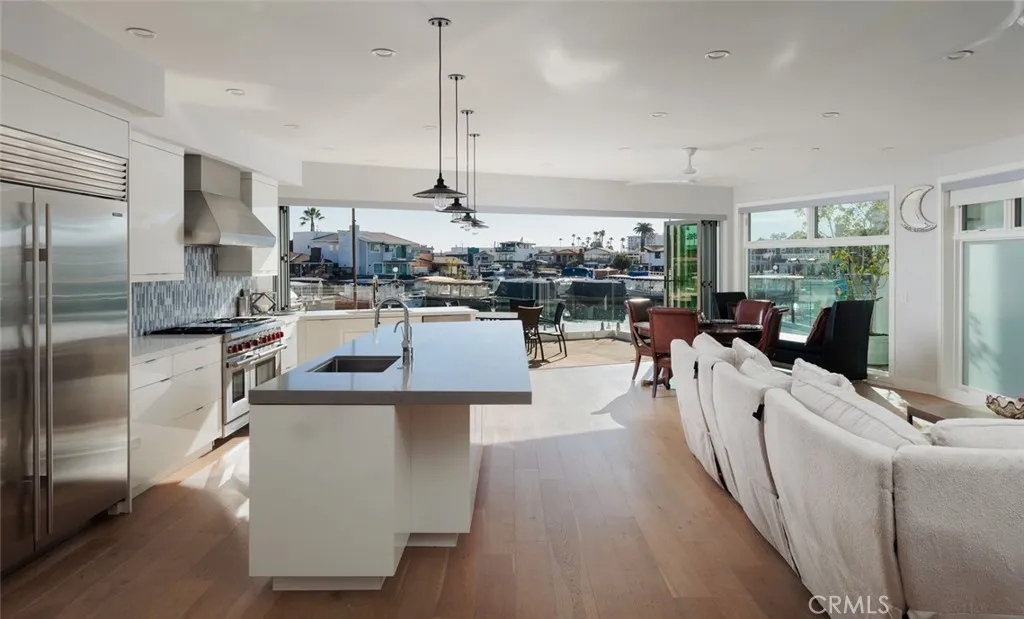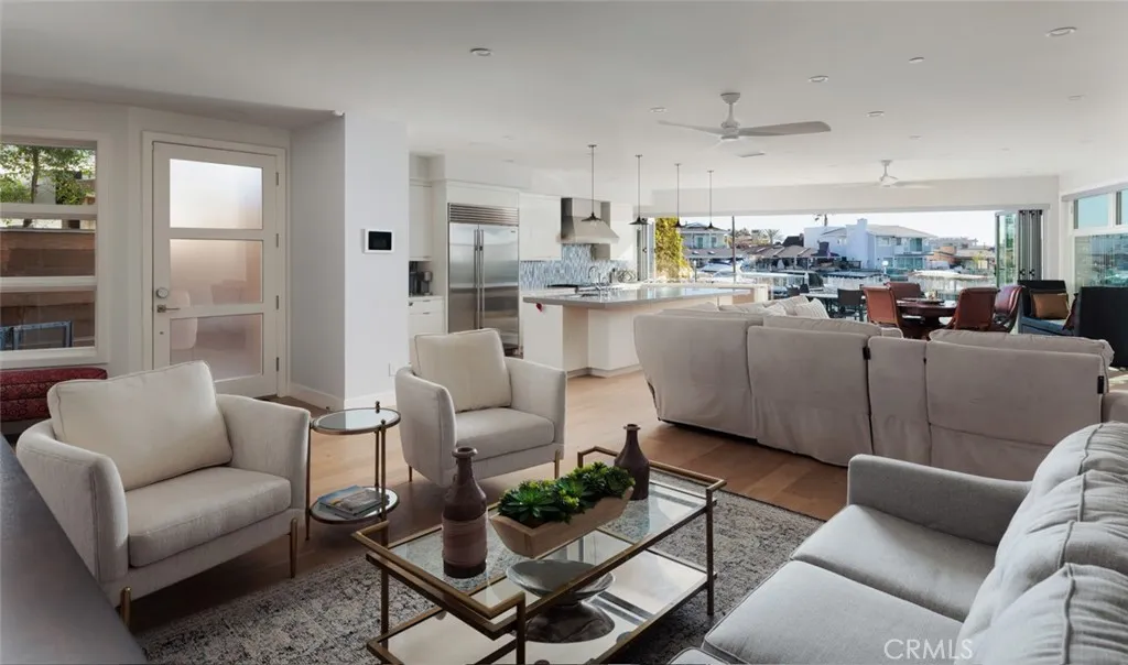 Set within the exclusive, guard-gated enclave of Balboa Coves—one of just 68 residences—this exceptional bayfront home offers a refined coastal lifestyle with unobstructed water views. Enjoy direct access to your own sandy beach and a private dock accommodating a 35-foot boat, all just moments from the best of Newport Beach. An elevator services all three levels, creating effortless flow throughout the home. The main level features an open-concept great room with wide-plank French oak floors, a sleek fireplace, and accordion doors that open to the waterfront, blending indoor and outdoor living. The chef’s kitchen is beautifully appointed with a Wolf range, Sub-Zero refrigerator, Bosch dishwasher, wine refrigerator, walk-in pantry, and a generous island ideal for entertaining. A waterside dining area, en-suite guest bedroom, and powder room complete this level. Upstairs, the primary suite is a serene retreat with sweeping bay views, a private balcony, and a spa-inspired bathroom featuring a freestanding soaking tub, glass-enclosed shower, dual vanities, and a custom walk-in closet. Two additional en-suite bedrooms and a laundry room complete the second level. The expansive rooftop deck spans over 1,000 square feet and is designed for entertaining, featuring a fully built-out rooftop kitchen with commercial-grade equipment, panoramic bay views, and elevator access—perfect for hosting under the stars. An additional bedroom with a bathroom on the roof-deck provides versatility as a bedroom, gym, or an office. Enhanced by smart-home automation, an oversized two-car garage with a built-in, air-conditioned office, a private community park, and ample guest parking. Ideally located near Lido Marina Village, Fashion Island, and world-class golf, this is coastal living at its finest.