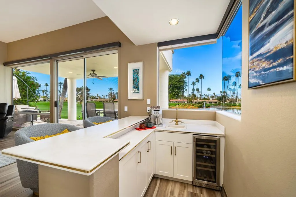 Price Adjustment~Spectacular Lakefront setting with some of the finest views in Desert Horizons Country Club. This lovely furnished 3-bedroom, 3-bath St. Andrews floor plan showcases sweeping Mountain, Lake, and Double fairway views overlooking 6th and 7th Fairways. A private courtyard entry welcomes you into a tastefully appointed home where the Great Room features pristine tile flooring, a fireplace, walls of windows, and a dining area with wet bar--ideal for entertaining. The Chef's Kitchen has been updated with new appliances and cabinetry, while recent improvements include a newer water heater, new HVAC system, and updated tile flooring. The Primary Suite offers a spa-like retreat with a large walk-in shower, soaking tub, and walk-in closet. A Guest Suite includes an en-suite bath, and a versatile 3rd bedroom may also serve as a Den or Office with an additional bathroom just a few steps away. Step outside to the rear patio to enjoy breathtaking sunset views creating a serene setting for outdoor living and entertaining. Community Pool and Spa just steps away. A 2-car garage plus golf cart garage completes this picture-perfect lifestyle in a premier Indian Wells location. Newly Updated Desert Horizons Country Club--home to world-class amenities; Dining, new Courts Pavilion with 11 Pickleball Courts, 2 Tennis Courts, State-of-the-Art Fitness & Wellness Center, private 18-Hole Golf Course, and an exciting calendar of social events.