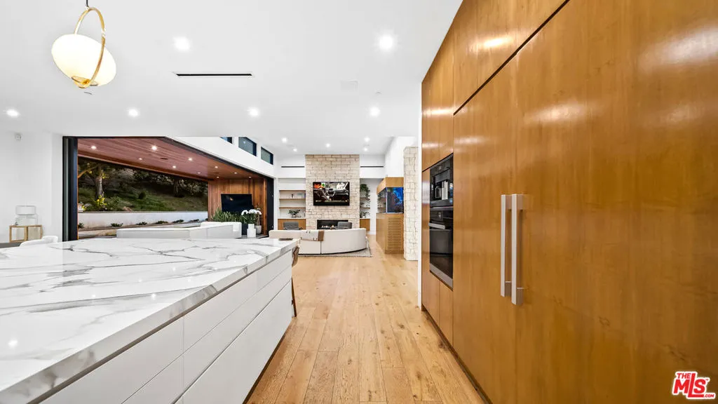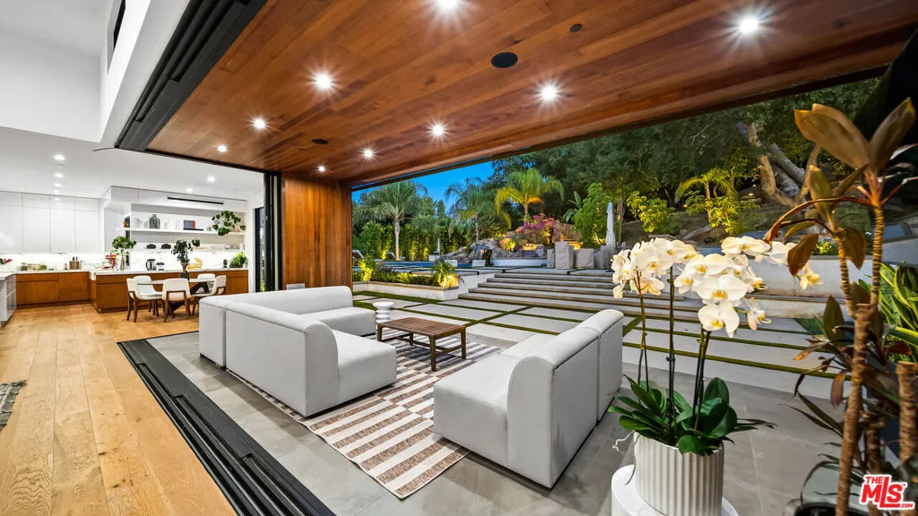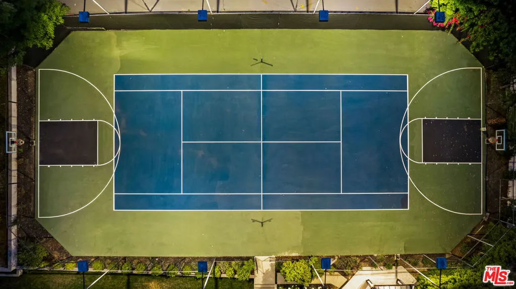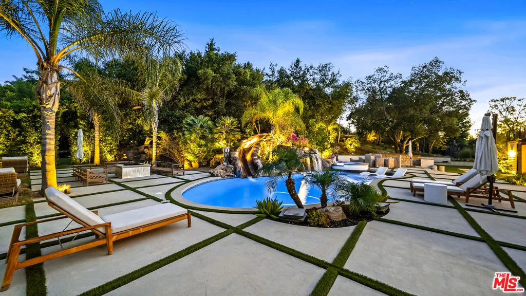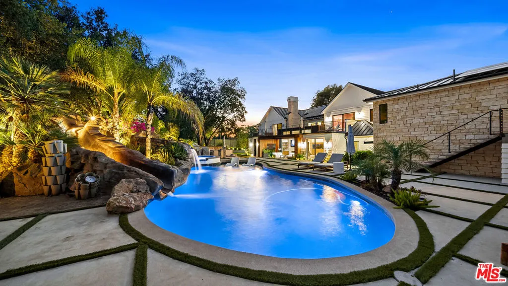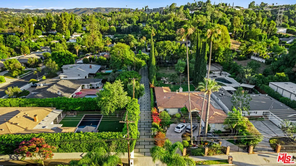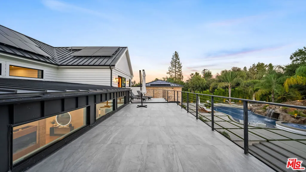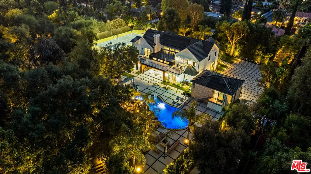 Experience exceptional living in this newly constructed modern farmhouse, located on a sprawling 1.6-acre flag lot in Tarzana. This extraordinary estate, designed for grand living and entertaining, is accessed through two private gates and a 400-foot driveway, leading you to a home that combines elegant design with practical features. The home epitomizes refined living and timeless luxury, offering 5 spacious bedrooms and abundant room for comfort and convenience. The expansive open-concept layout is perfect for both relaxation and entertaining, with seamless transitions between indoor and outdoor spaces. The custom chef's kitchen boasts state-of-the-art Miele appliances, a built-in coffee maker, wine cellar, butler's pantry, large pantry, and a massive center island with bar seating. The kitchen opens up to the large family room featuring a fireplace, aquarium, custom shelving and views of the meticulously landscaped grounds, creating a welcoming atmosphere for everyday meals and grand gatherings. A formal dining room, living room, lounge area, and an additional eating area complete the downstairs.The second level offers an additional family room, oversized ensuite bedrooms, and a laundry room. The luxurious primary retreat features beamed ceilings, a fireplace, custom shelves, an expansive balcony that overlooks the backyard, dual large closets with custom cabinetry, dual vanities, a soaking tub. and a large steam shower. The estate is designed with entertainment in mind, featuring a full-size tennis and basketball court, a resort-style pool with a water slide, waterfalls, a baja shelf, and a grotto. There's also a versatile pavilion with a bath and wet bar for hosting events, and a covered tennis pavilion. Enjoy cinematic experiences in the state-of-the-art home theater, or unwind in the private gym with direct access to the tennis and basketball court.Additional features include a main floor ensuite bedroom, a detached guest house for visitors or extended family, a three-car garage, a smart home and security system, and ample parking for multiple cars.