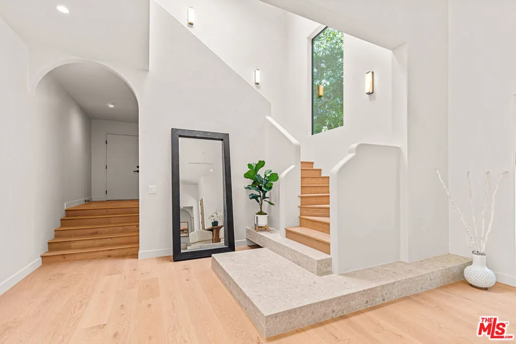 Tucked away on a peaceful street in one of Brentwood's most coveted enclaves, this strikingly updated 4-bedroom, 6-bath modern residence offers refined design, impressive scale, and effortless livability. A dramatic 10-foot entry door opens to a voluminous interior highlighted by soaring 14-foot ceilings and an expansive, open layout ideal for both everyday living and entertaining. The heart of the home features a chef-caliber kitchen equipped with top-tier appliances, an oversized dining area, and multiple living spaces designed for seamless flow. These areas connect effortlessly to a private backyard retreat, complete with a newly constructed pool and spa, along with dedicated spaces for outdoor dining and relaxation.The primary suite serves as a true sanctuary, boasting a spa-inspired bathroom with dual vanities, a freestanding soaking tub, and a custom walk-in closet. Additional amenities include two thoughtfully placed powder rooms, a newly added theater, and a spacious entertainment lounge with a fireplace perfect for hosting gatherings or enjoying quiet evenings at home. Notable upgrades include a fire-resistant standing-seam metal roof, fully updated electrical and plumbing systems, and a generous three-car garage with ample storage. A rare opportunity to own a turnkey modern home in a premier Brentwood location.