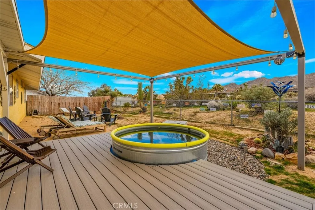 Income Producer! Turn-Key Joshua Tree Sanctuary with Proven STR Income of 47K In 2025! The drive to the property sets the mood, filled with vast desert landscapes, majestic Joshua trees, and the commanding Boulder Mountains of Joshua Tree National Park nestled in the backdrop. Nestled on almost a half-acre lot and situated in the coveted Friendly Hills neighborhood, just minutes from gourmet dining, boutique shopping, and a short drive to The Joshua Tree National Park and MDLT hiking trails, this home provides the ideal location. Pulling into the driveway, you immediately notice the tasteful paint scheme, mature shade trees, and desert landscaping full of cacti, Ocotillo, and other desert flora. Stepping inside, you’re greeted by a tastefully designed interior showcasing meticulously curated furniture and decor, beautiful wood tile flooring, and plenty of natural light, providing an open and airy feeling that flows throughout this two-bedroom, one-bathroom home. The fully loaded kitchen, equipped with an oven, fridge, microwave, and dishwasher, opens up to the dining area, making entertaining a delight. In the bonus room, you’ll find even more space, perfect for a home office, gym, art studio, or a place to relax and enjoy the luxury sauna at the end of the day. Each bedroom is generously sized, featuring stylish furniture and decor, along with individual mini-split systems for efficient heating and cooling. Continuing with the theme, the bathroom features thoughtful pieces, including a full bathtub/shower, a chic vanity, and a custom mirror. Now, in the backyard, you can enjoy one of the reasons people love visiting our desert. Accompanied by stunning panoramic views, you’ll find outdoor living at its best. With a large covered patio perfect for get-togethers, barbecues, and outdoor dining, along with the iconic cowboy pool and spa/Jacuzzi, a private oasis awaits. Whether you’re relaxing on the wood deck under the sail shade, enjoying a soft desert breeze, or being captivated by the starry nights under the Milky Way, you’ll experience the perfect blend of comfort and adventure. Additional features include chain-link/privacy fencing in the backyard, a storage shed, an outdoor wood stove, a washer and dryer, ceiling fans, 3 mini splits and wall heater for efficient heating and cooling, two-car garage, and more! Don’t miss out on this rare opportunity—arrange your private tour today!