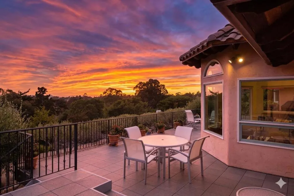 Welcome to a sun-kissed retreat in Rancho Rio Vista, where Mediterranean charm meets resort-style living. This warm and inviting estate offers over 3,400 sq.ft. of character and comfort in the 3 bedroom/3 bath main house, and a charming studio apartment above the garage ideal for guests or creative use on over an acre of land. Classic tile floors, graceful archways, skylights and soaring ceilings flow throughout the home creating a light and airy environment. The living room features a gas log fireplace, open-beam ceilings, French doors and sunroom with sweeping mountain views to the south. The kitchen is designed for gourmet cooking, complete with island, breakfast bar and nook, double ovens, plenty of storage and wine fridge, while the formal dining room offers an elegant and intimate entertaining space. The ground-floor primary bedroom suite is a peaceful haven with hillside views, spa-like bath and a secluded deck with private hot tub access. Outside features include a water feature, lush gardens blooming with roses, fig and fruit trees, rosemary and lavender, hillside olive orchard, and large south-facing deck with barbecue area and space to relax or dine al fresco. With a 3-car garage, owned solar, air conditioning and generator, this is Carmel living at its finest.