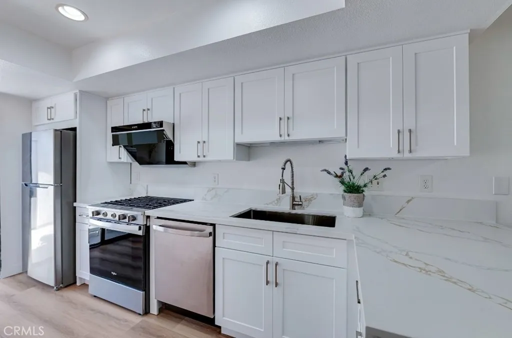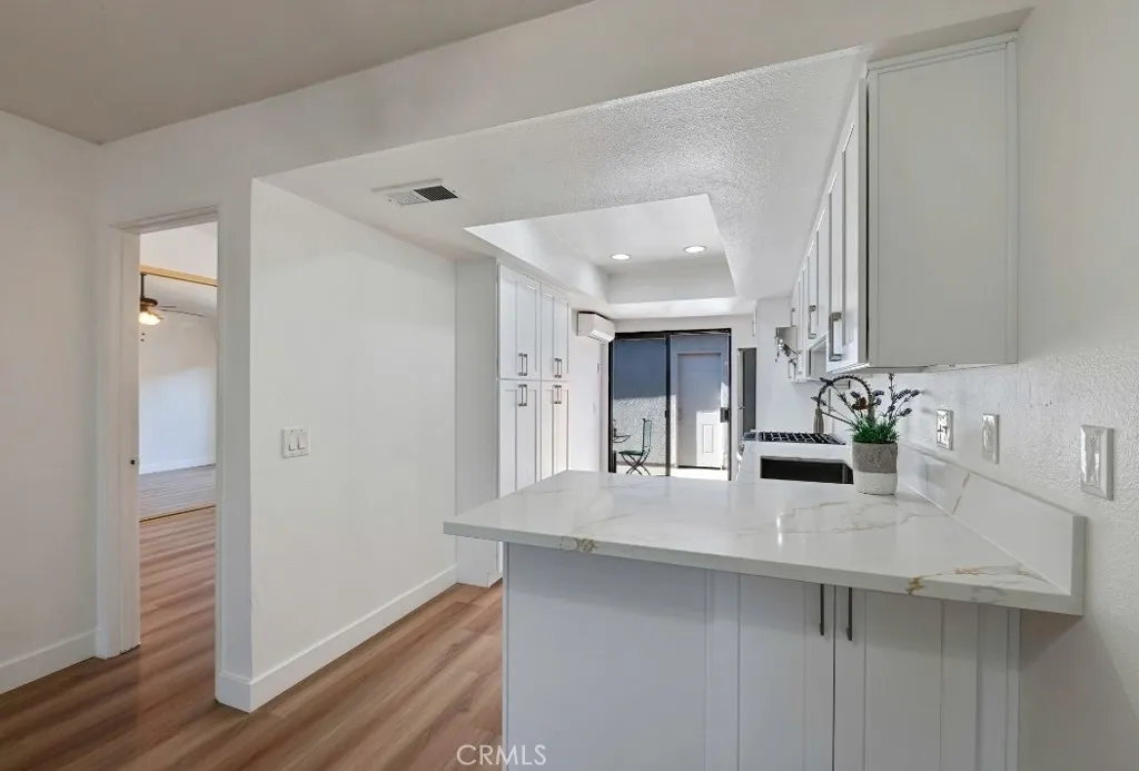 Turnkey unit located in the Bellflower Manor community. This is one of the best-maintained units in the complex, reflecting true pride of ownership and featuring a complete, high-quality remodel throughout. The home offers a great open floor plan with a combination of ceramic tile and laminate flooring. The spacious living room. The magnificent gourmet kitchen is equipped with quartz counters, custom cabinetry, breakfast counter, and an adjacent dining area. The incredible master suite features a completely remodeled full bath. All bedrooms are spacious and offer excellent closet space. The private backyard is nicely decorated. The unit also boasts an oversized two-car garage with extra storage space and inside laundry facilities. The community amenities include a pool, spa, clubhouse, lush greenbelt areas, and ample guest parking.