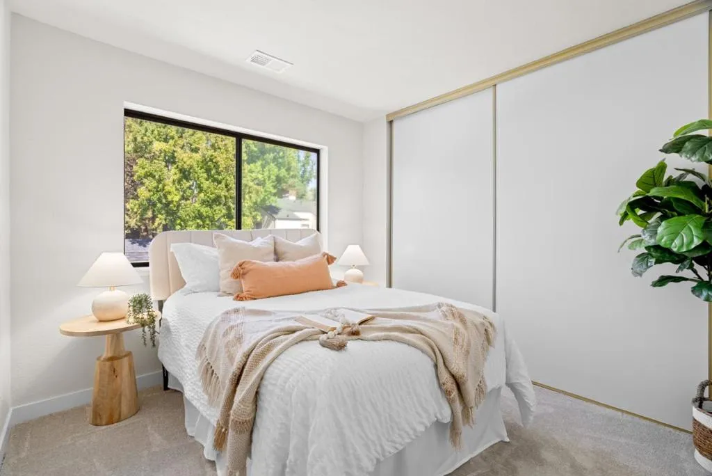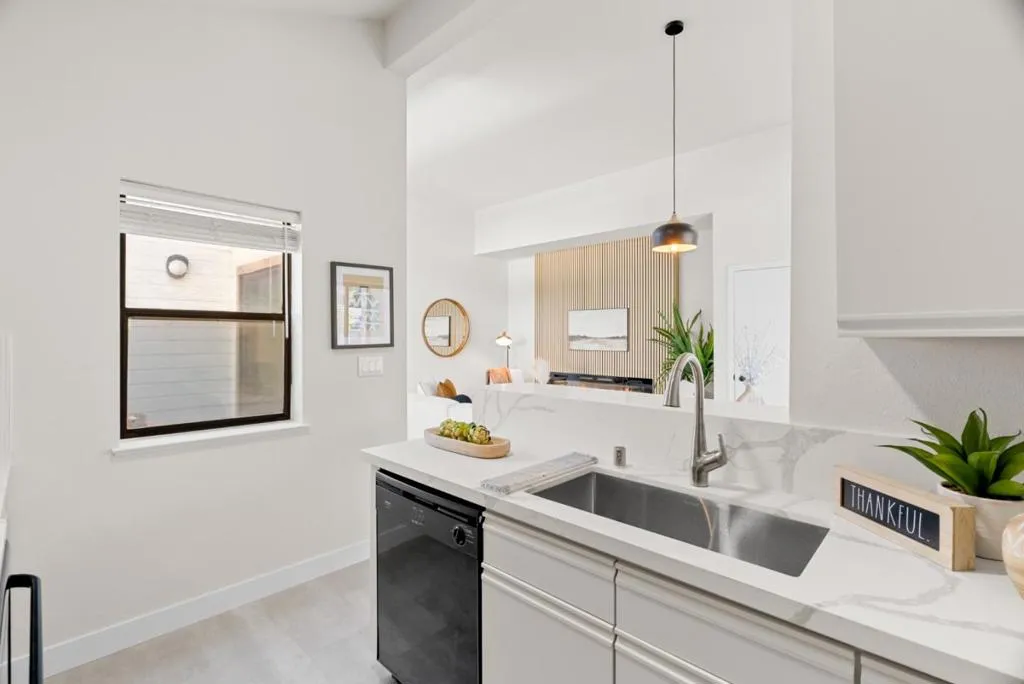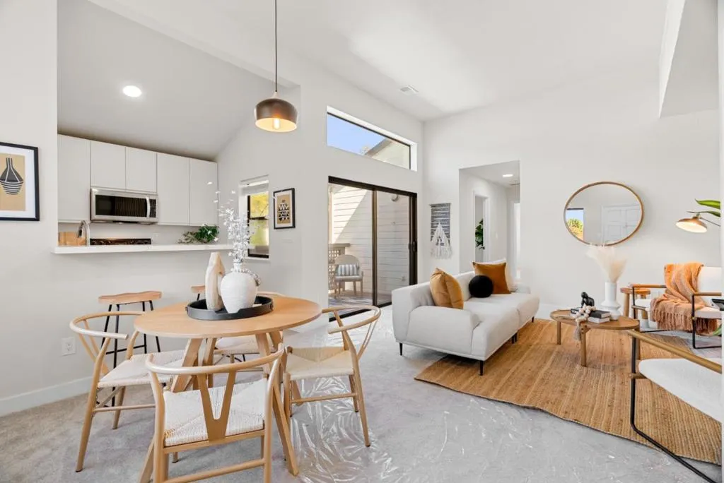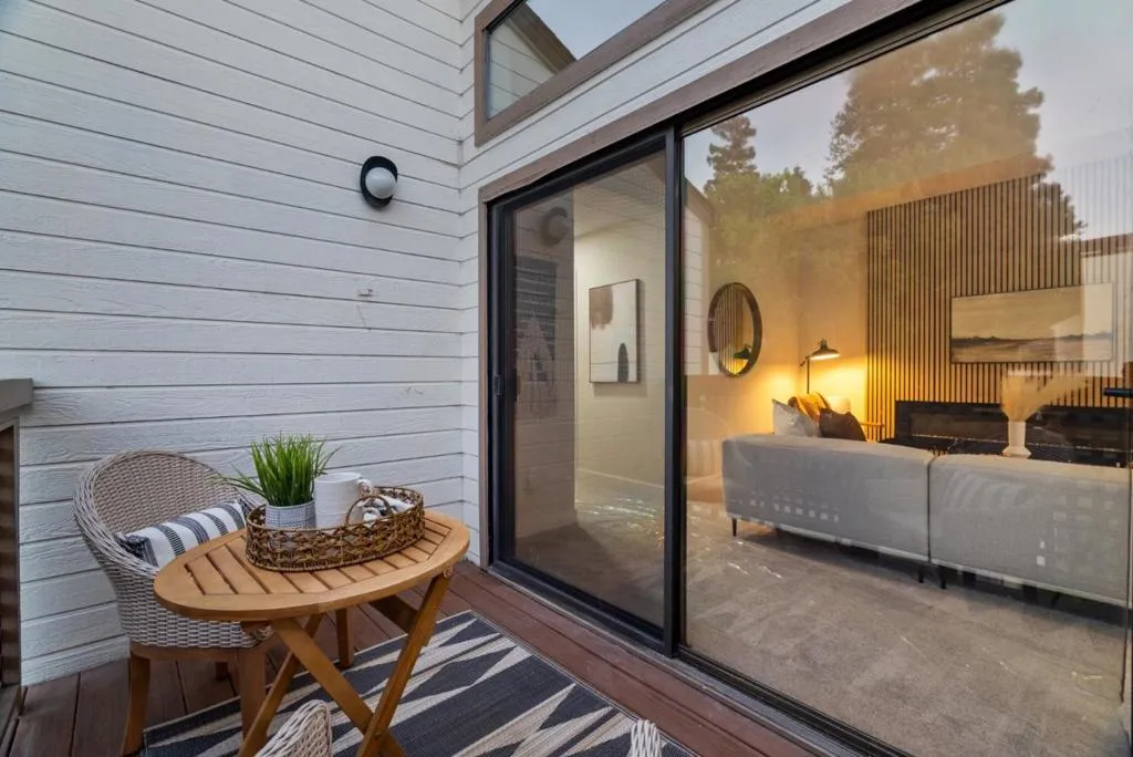 Imagine morning walks through Townsend Park, then coming home to your own light-filled sanctuary. This 2-bedroom, 1-bath condo isn't just updated. It's transformed. Soaring vaulted ceilings flood the great room and kitchen with natural light, creating an airy backdrop for daily life. The kitchen dazzles with quartz countertops and matching backsplash, sleek cabinetry, and waterproof flooring. The fully permitted bathroom brings spa-like luxury with brushed gold fixtures, a contemporary vanity, and luxury vinyl flooring. Your great room centers around a stunning custom feature wall with wood-slat accents and a built-in electric fireplace, pre-wired and ready for entertaining. Fresh designer paint, plush new carpet, sleek lighting, and premium finishes throughout mean you can simply unpack and start living. A rare dedicated laundry room inside, private balcony, and ground-level garage make everyday life effortless. Enjoy the community pool, nearby green spaces and courts, plus minutes to 101/880, SJC Airport, and Silicon Valley's top employers. This one won't last long. Come see what makes it special.