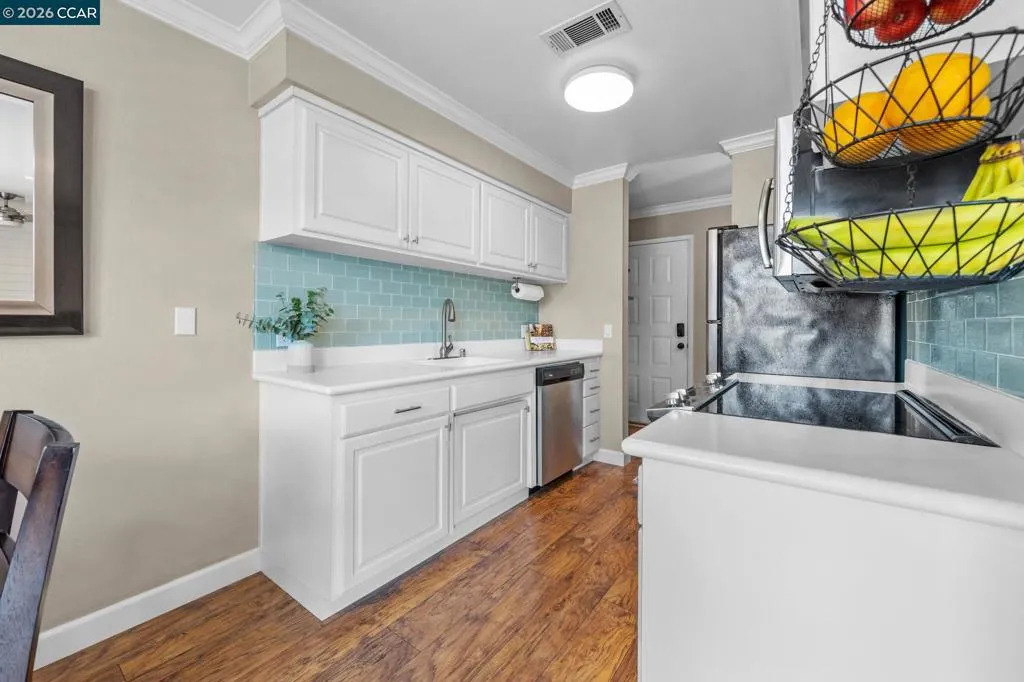 Welcome to this beautifully updated upstairs unit featuring 2 spacious bedrooms and 1 full bathroom. Inside you’ll find an open layout with tons of natural sunlight, beautiful hardwood floors and elegant crown molding throughout. The freshly remodeled bathroom adds a touch of luxury, while the in-unit laundry offers ultimate convenience. Both bedrooms include Elfa closet organizers, maximizing storage and functionality. Enjoy your morning coffee on the private balcony with peaceful views of the well-maintained grounds. This is one of the few units in the complex that offers this unique, serene view! Or take in the stunning scene of Mt. Diablo right from your front door. Conveniently located close to BART, this home is perfect for commuters or anyone seeking easy access to other parts of the Bay Area. It's also just around the corner from Oak Grove and Countrywood shopping centers, offering a variety of grocery stores, restaurants, coffee shops, and retail options. With ample guest parking and thoughtful interior touches, this home blends comfort, style, and convenience in one perfect package. Don’t miss out - schedule your tour today!