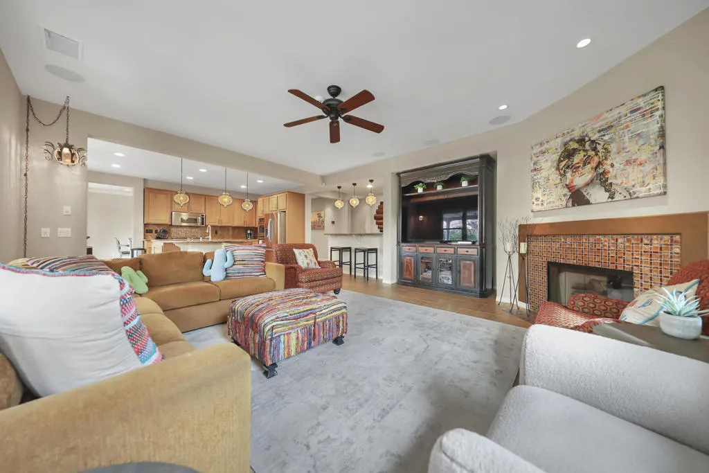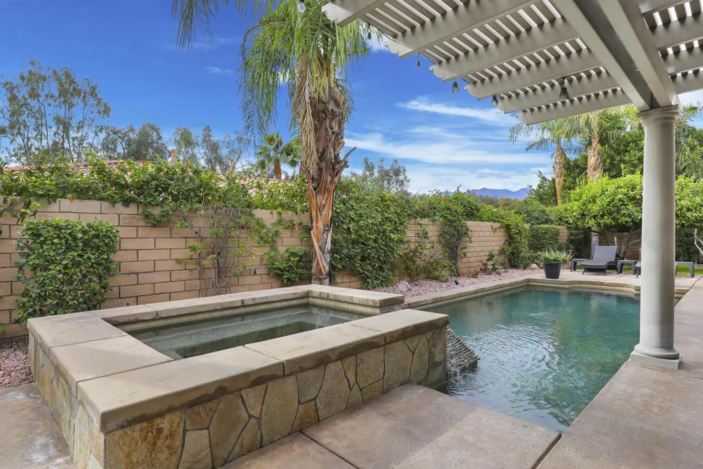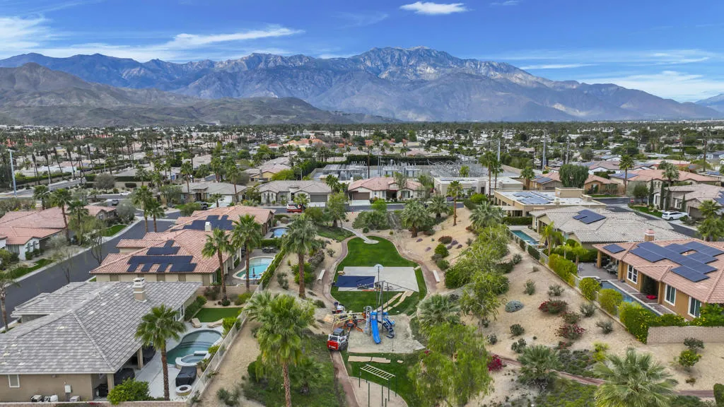 Lovingly maintained by its original owner, this well-appointed home blends comfort with purposeful design. A traditional floor plan offers defined living spaces for both daily life and gatherings, complemented by a generous kitchen that adjoins the main living area. The kitchen is outfitted with abundant cabinetry featuring pull-out shelving, stainless steel appliances, an oversized island, and a sunny breakfast nook. The living room is complimented by a glass-tiled fireplace and a fully equipped wet bar with a sink, wine rack, and custom cabinetry, seamlessly connecting the kitchen and living spaces. The primary suite is generously sized and features dual vanities, two walk-in closets, a soaking tub, and a large walk-in shower with bench seating. Two secondary bedrooms share a Jack-and-Jill bathroom, while the additional bedroom enjoys its own private en suite. Outdoor living is equally inviting, with mature landscaping creating a private retreat. The backyard includes a PebbleTec saltwater pool and spa, misting system, extended alumawood patio cover, plenty of seating areas, and mature lemon, orange, and lime trees ideal for both relaxation and entertaining. Additional highlights include updated dual HVAC systems, new hot water heater, new pool salt cell, surround sound throughout, Vivint security system with cameras, laundry room with utility sink, and an epoxied garage floor. Located within the gated community of Mission Shores, residents enjoy scenic lake and mountain views, complemented by close proximity to premier desert amenities. The HOA provides front yard landscaping, cable and WiFi, lake access, a community park with playground and basketball court, and well-maintained common areas. Ideal as a primary residence, second home, or desert getaway, this property offers both comfort and convenience.
