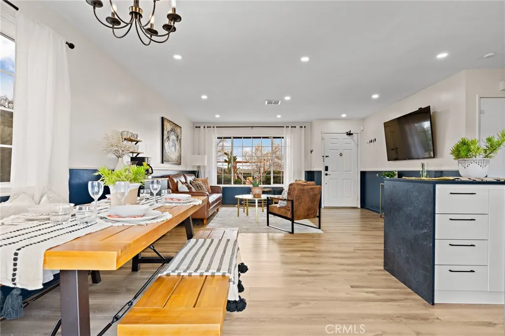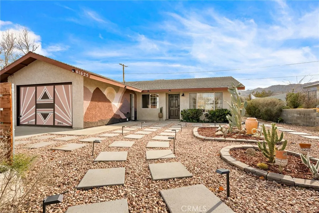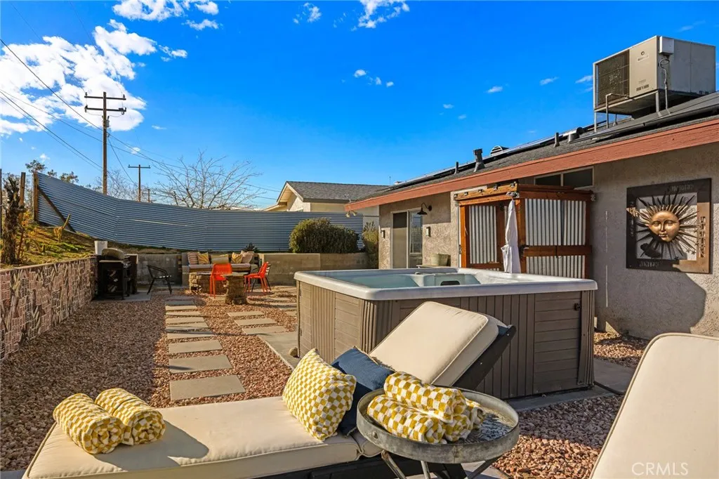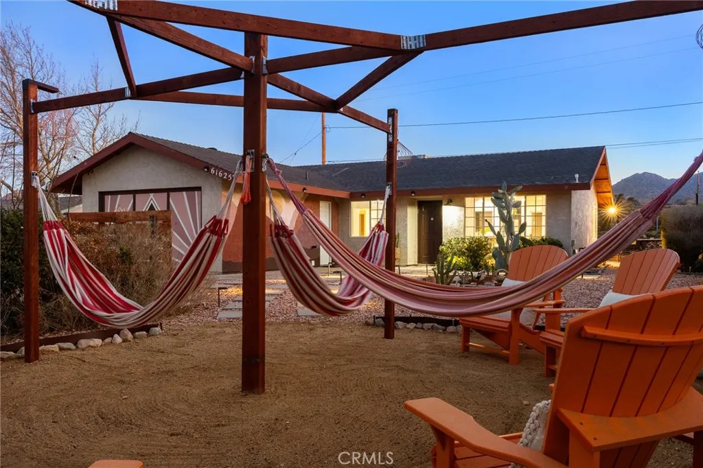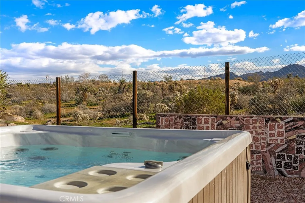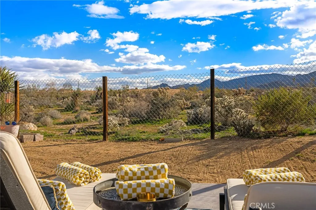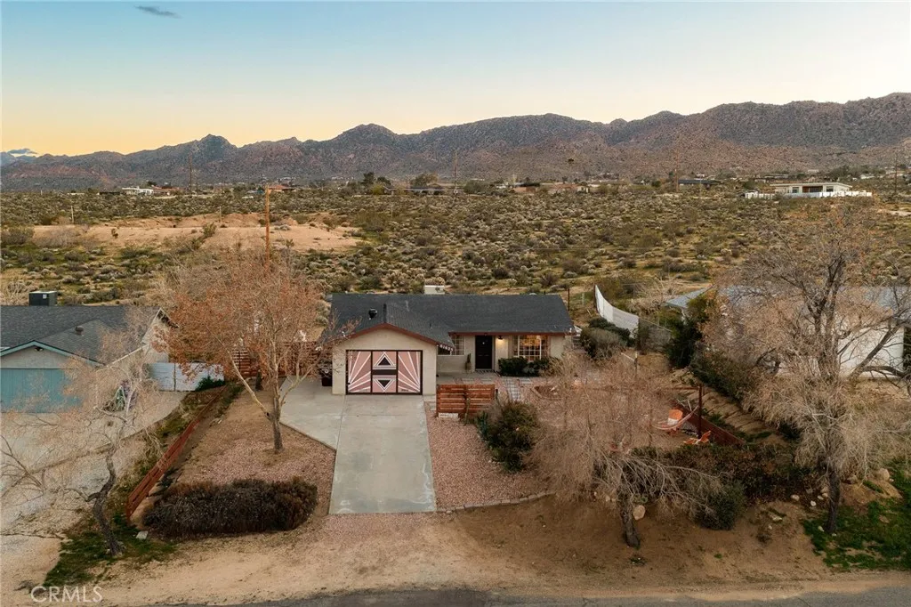 Tucked into the heart of Joshua Tree Village, this spacious three-bedroom desert home offers a rare blend of views, privacy, and walkable convenience. Designed for effortless living, the open-concept floor plan is filled with abundant natural light and views of the Joshua Tree National Park Ridgeline, creating an inviting space for gathering, relaxing, and hosting family and friends. Outside, the property is surrounded by lush desert landscaping with mature shade trees on irrigation, offering a true oasis feel and multiple outdoor living areas. Just 4 minutes from the entrance to Joshua Tree National Park, with direct boulder access across the street in the Desert View Conservation Area, adventure, hiking, and iconic desert scenery are literally at your doorstep! Downtown Joshua Tree—known for its farmers markets, artist open-air markets, boutiques, and dining—is conveniently located just down the road, anchoring this home in the creative heart of the High Desert community. Evenings are where this home truly comes alive. Relax in a hammock in the expansive private front yard while overlooking downtown Joshua Tree and the distant desert horizon. Host music nights and poker games in the attached garage, fire up the BBQ and gather around the gas firepit as the sun sets behind the National Park ridgeline, or unwind under a sky full of stars in the jacuzzi, surrounded by the peaceful quiet that draws over three million visitors to Joshua Tree each year. The home features paid-off solar, adding long-term value and energy efficiency, and has history as an active airbnb rental, making it ideal as a primary residence, weekend getaway, or investment property. This is truly 'Joshua Tree living'—close to the National Park, close to town, and grounded in calm nature, creative community, with space to breathe.