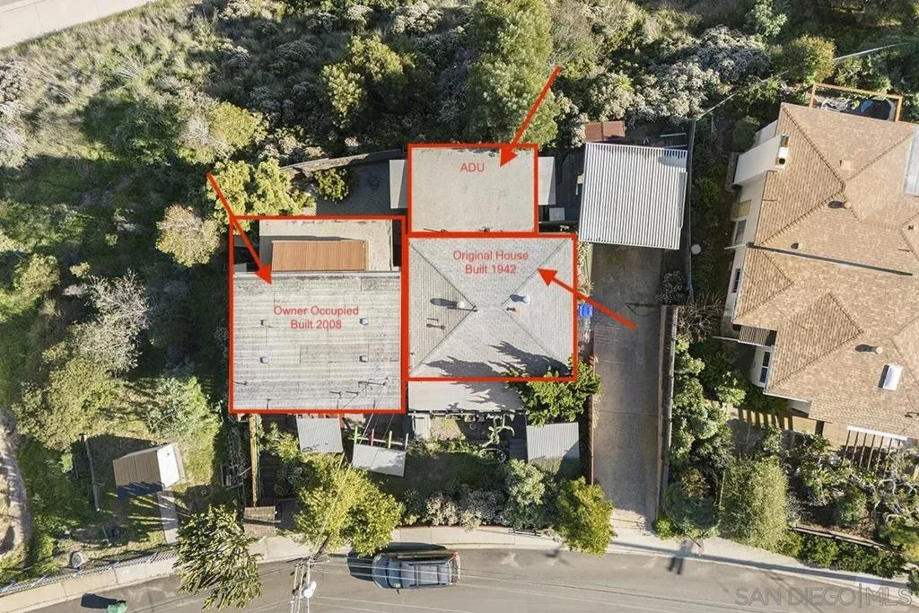 One-of-a-kind multi-generational and income-producing opportunity in San Diego, ideal space for an artist retreat. The Frank Lloyd Wright inspired main home features 1 bedroom and 2 baths with a sunken living room, soaring 10-foot ceilings, built-in cabinetry, cedar ceiling in the primary bedroom, distressed fir and cork floors, ancient redwood accents, and custom wood windows and doors. Enjoy a private backyard with a tranquil zen garden, balcony, and fireplace. The main house is 1,150 sqft and connected is the original house 750 sqft 2-bedroom, 1-bath house and a 350 sqft ADU, thoughtfully arranged to provide privacy while offering versatile living and rental options. Perfectly located near shopping and local amenities. This is truly a rare opportunity to own in the heart of San Diego.