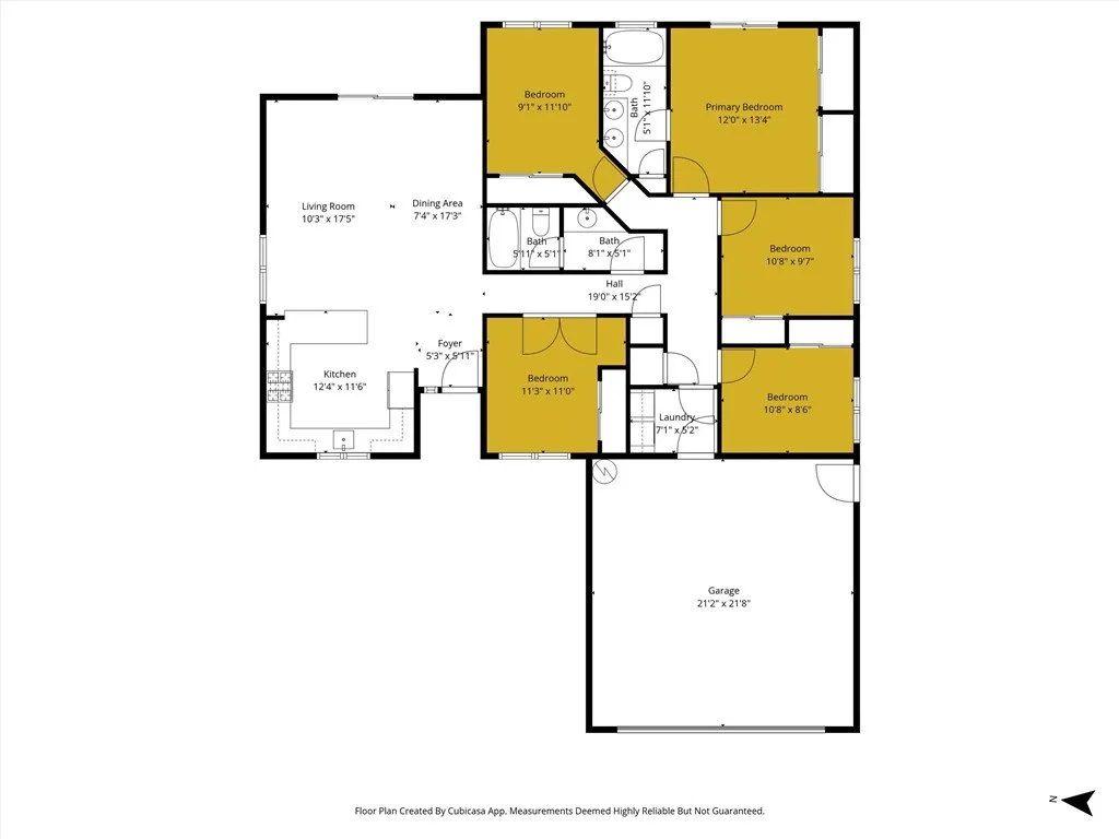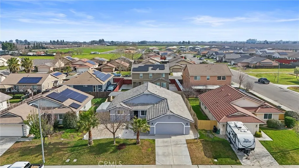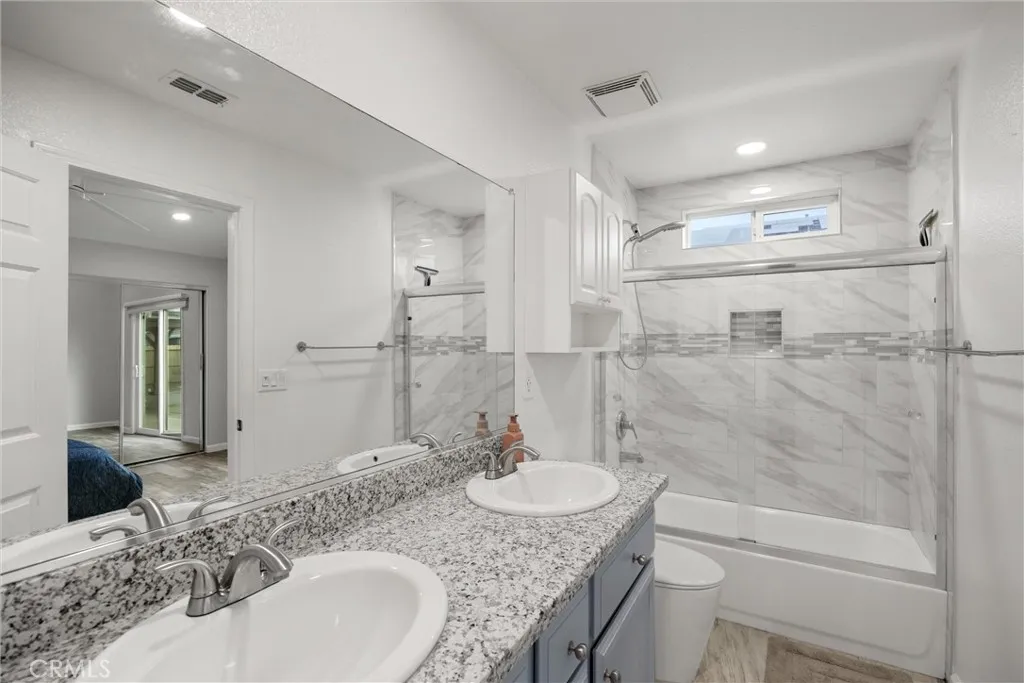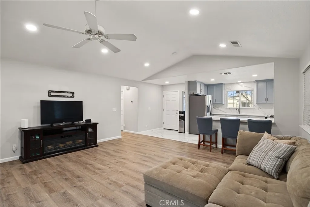 Freshly updated and move-in ready, this beautiful five-bedroom, two-bath home is designed for comfortable living and effortless entertaining. The heart of the home features an updated kitchen showcasing stunning custom quartz countertops, stylish tile finishes, and an open-concept layout that flows seamlessly into a spacious living room with soaring vaulted ceilings. Large sliding glass doors flood the space with natural light and create a perfect indoor-outdoor connection to the backyard—ideal for gatherings and everyday living. Step outside to a thoughtfully designed, low-maintenance backyard with expansive concrete areas and two large pergolas, providing generous shade for relaxing afternoons and outdoor entertaining and a large shed for extra storage. The primary suite offers a private retreat, complete with an attached ensuite bathroom featuring a soaking tub—perfect for unwinding at the end of the day. Additional highlights include a cement tile roof for long-term durability, central heating and air for year-round comfort, and a 24-hour surveillance system offering added peace of mind. With low-maintenance features throughout and tasteful updates already completed, this home is truly turnkey an ready for its next owner to enjoy. A wonderful opportunity to own a spacious, updated home that blends style, comfort, and ease of living. Buyer to verify all information to their satisfaction.