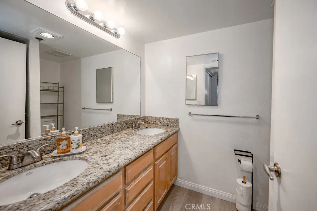 Recently reduced and offering exceptional value, this beautifully maintained first-floor two-bedroom, two-bath condo is located in a thoughtfully renovated community that reflects true pride of ownership. Move-in ready, the home features newer flooring, updated bathrooms, and a functional open layout designed for comfortable everyday living. The spacious primary suite offers a peaceful retreat with mountain views, dual closets, and dual vanities with stone counters, complemented by a newly tiled walk-in shower. The second bedroom provides flexibility for guests, a home office, or creative space, with a full bath conveniently nearby. The kitchen is efficiently designed for daily living and includes a dishwasher, microwave, and a dedicated laundry nook with washer and dryer. A cozy gas fireplace and private balcony create inviting indoor-outdoor living spaces. Additional highlights include two assigned parking spaces with easy access via elevator from the subterranean garage, enhancing everyday convenience. The HOA has recently completed major exterior improvements, including a new roof, gutters, fresh paint, and reconstructed balconies and walkways, enhancing both appearance and long-term value. Ideally situated directly across from Reseda Recreation Center Park, enjoy easy access to tennis courts, a pool, basketball and baseball facilities, open green space, and a scenic lake. Located just minutes from CSUN, Pierce College, shopping, and dining, this home offers the perfect blend of comfort, convenience, and community.