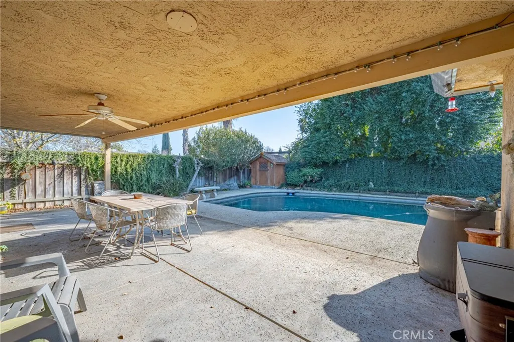 OWNED SOLAR...PEBBLE TEC POOL...NO MELLO-ROOS...NO FLOOD ZONE! Welcome to this beautifully updated 3-bedroom, 2-bathroom home in North Merced. Boasting 2,072 sq ft of living space on an expansive 8,767 sq ft corner lot in a peaceful cul-de-sac, this home offers both comfort and style. Step inside to a spacious entryway that opens to a formal living room, dining room and family room which features tall ceilings, a wood burning fireplace and built-in bookshelves creating an open and inviting atmosphere. The kitchen has been tastefully updated with Corian countertops and light wood cabinets, perfect for everyday living and entertaining. The primary suite features an enlarged en-suite bathroom complete with a walk-in shower, double shower heads, and a dual sink vanity. Step into the backyard retreat with an in-ground swimming pool finished with Pebble Tec, and covered patio ideal for relaxing or hosting gatherings. The home also includes owned solar (24 panels) for energy efficiency. Conveniently located near Merced College, Mercy Medical Center, schools, shopping and restaurants, this home combines luxury living with a prime location.