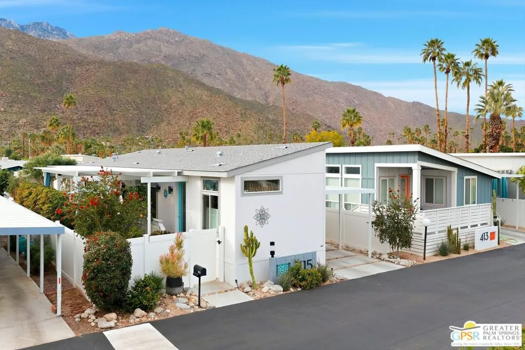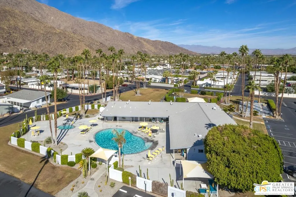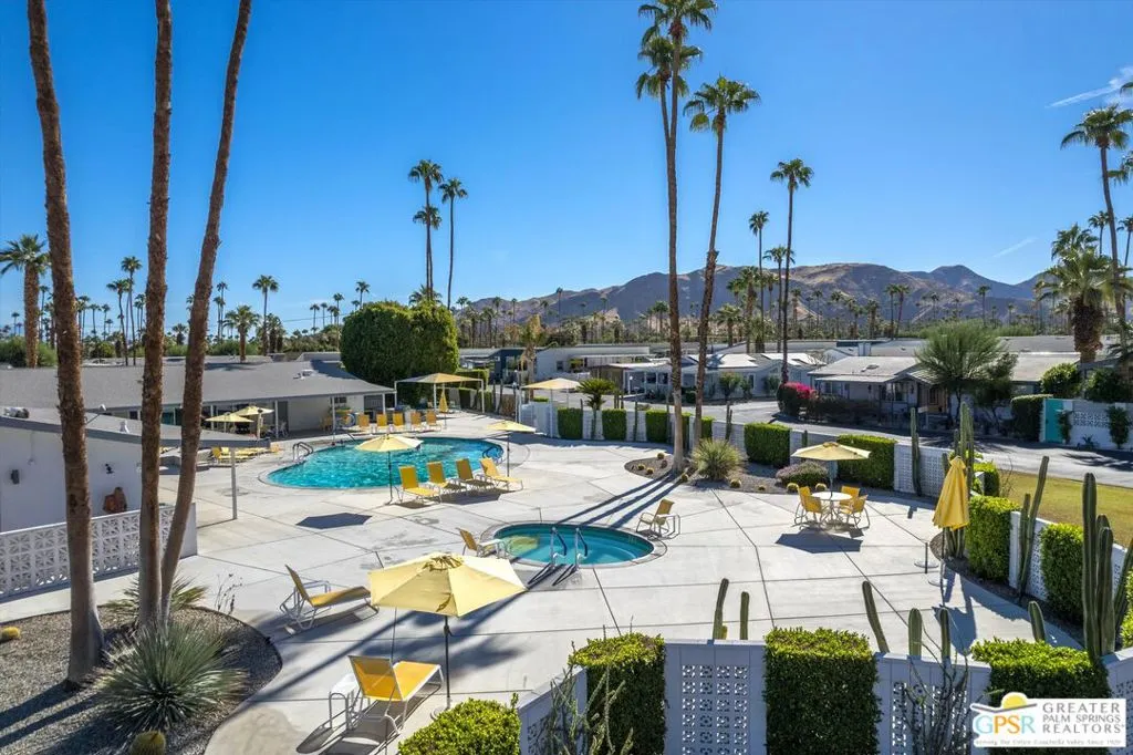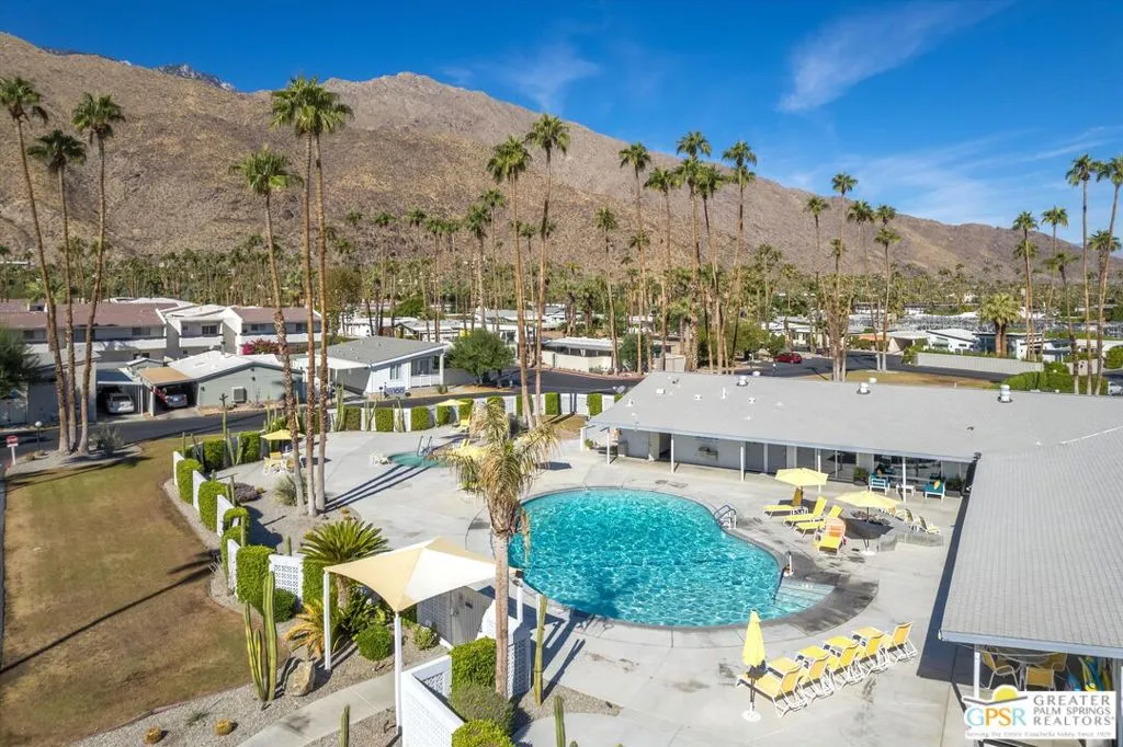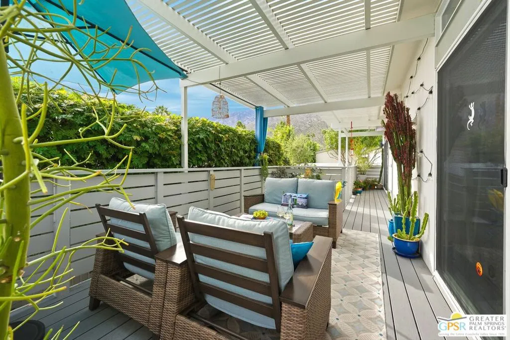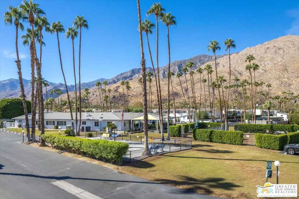 Located on a quiet street within the iconic Palm Springs Mobile Club, this thoughtfully landscaped home offers privacy without compromising spectacular mountain views. Leaning into the sought after mid-century modern design, the home delivers bright, efficient, low-maintenance desert living. Highlights include soaring 9-foot ceilings and clerestory windows that flood the space with natural light. The well-appointed galley kitchen is both stylish and functional. The primary suite features mirrored closets, an ensuite bath with a walk-in shower, and direct access to the outdoors. An expansive extended deck invites seamless indoor-outdoor living ideal for hosting or just relaxing under the desert sky. The fully enclosed yard is thoughtfully designed with outdoor curtains for year-round sun control and raised garden containers for effortless desert gardening, a perfect space for both entertaining and pampered pets. Offered turn-key furnished, this home is move-in ready. Palm Springs Mobile Club is a vibrant and welcoming community rich in amenities, including two dog parks, a pool and spa, fitness center, a clubhouse with dance hall and game room, billiards, shuffleboard, BBQ area, and fire pit, all embracing an exceptional Palm Springs lifestyle.