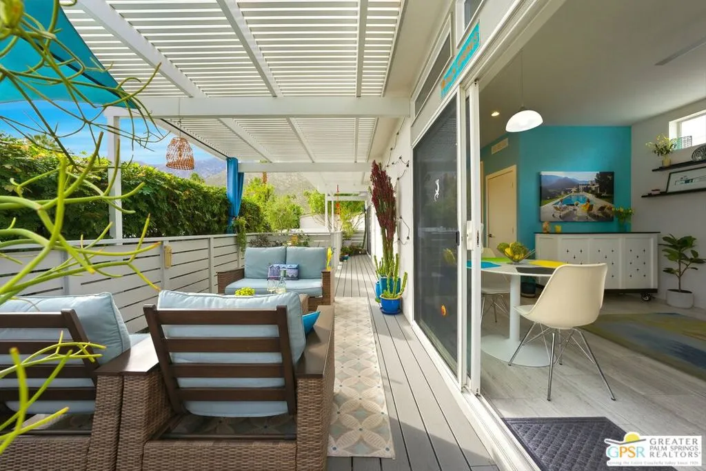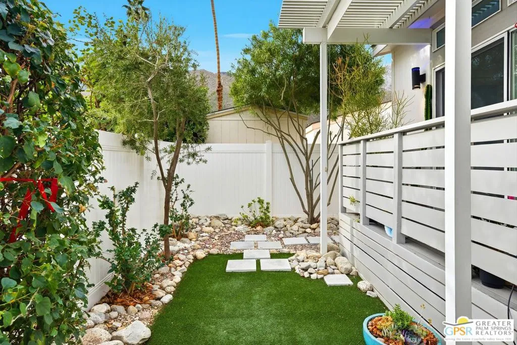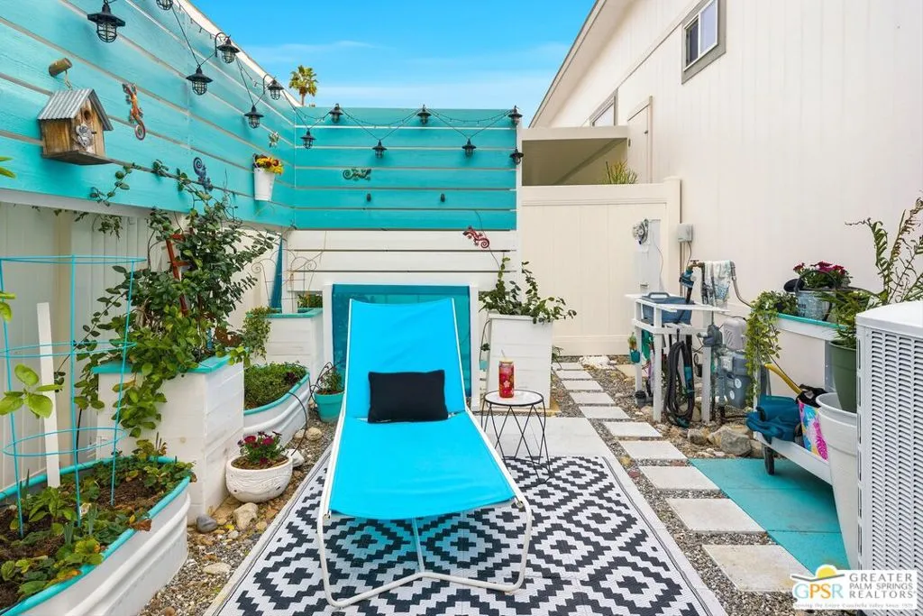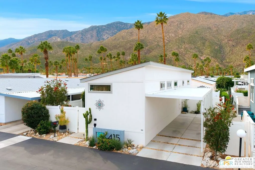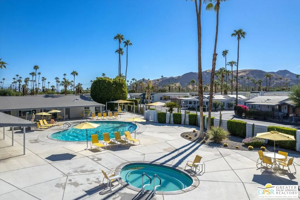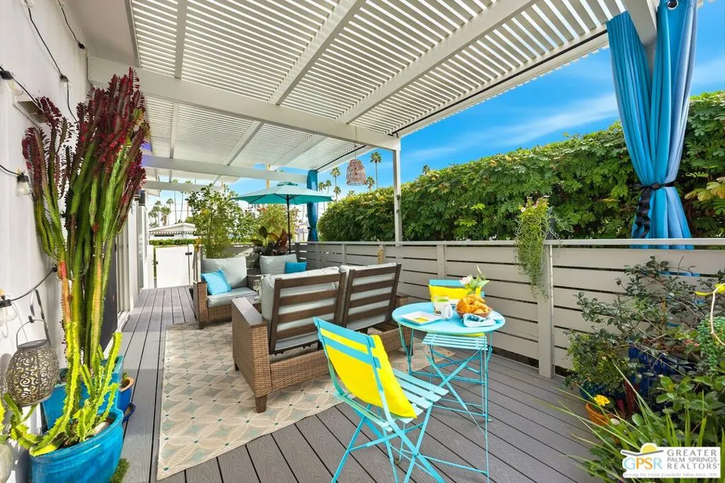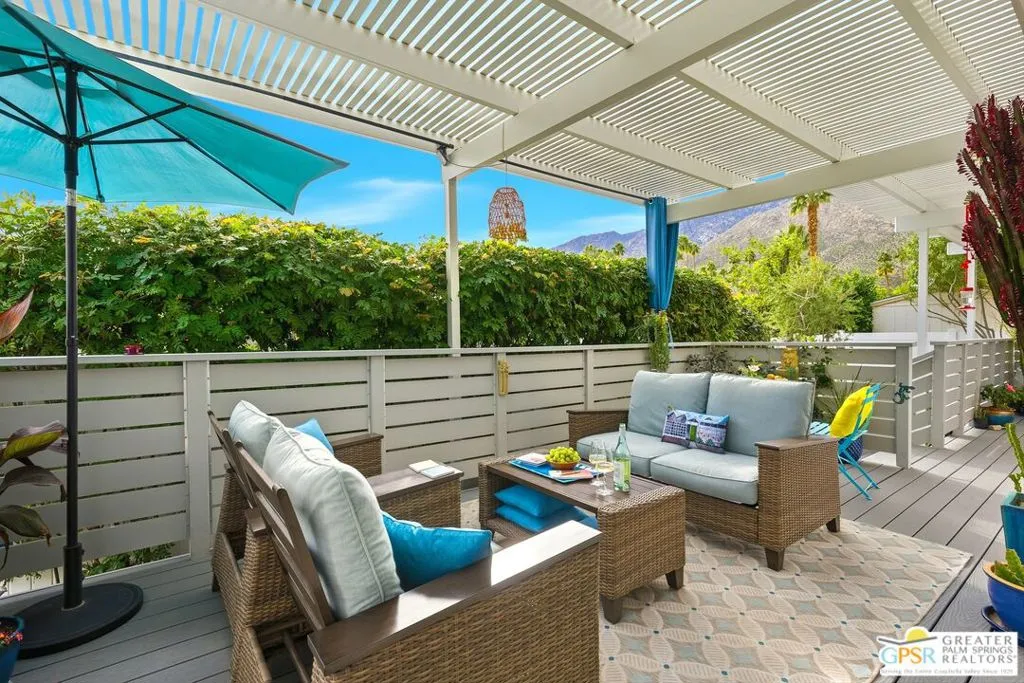 Located on a quiet street within the iconic Palm Springs Mobile Club, this thoughtfully landscaped home offers privacy without compromising spectacular mountain views. Leaning into the sought after mid-century modern design, the home delivers bright, efficient, low-maintenance desert living. Highlights include soaring 9-foot ceilings and clerestory windows that flood the space with natural light. The well-appointed galley kitchen is both stylish and functional. The primary suite features mirrored closets, an ensuite bath with a walk-in shower, and direct access to the outdoors. An expansive extended deck invites seamless indoor-outdoor living ideal for hosting or just relaxing under the desert sky. The fully enclosed yard is thoughtfully designed with outdoor curtains for year-round sun control and raised garden containers for effortless desert gardening, a perfect space for both entertaining and pampered pets. Offered turn-key furnished, this home is move-in ready. Palm Springs Mobile Club is a vibrant and welcoming community rich in amenities, including two dog parks, a pool and spa, fitness center, a clubhouse with dance hall and game room, billiards, shuffleboard, BBQ area, and fire pit, all embracing an exceptional Palm Springs lifestyle.