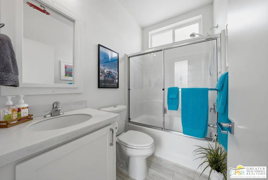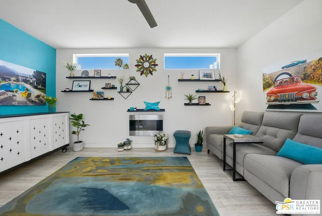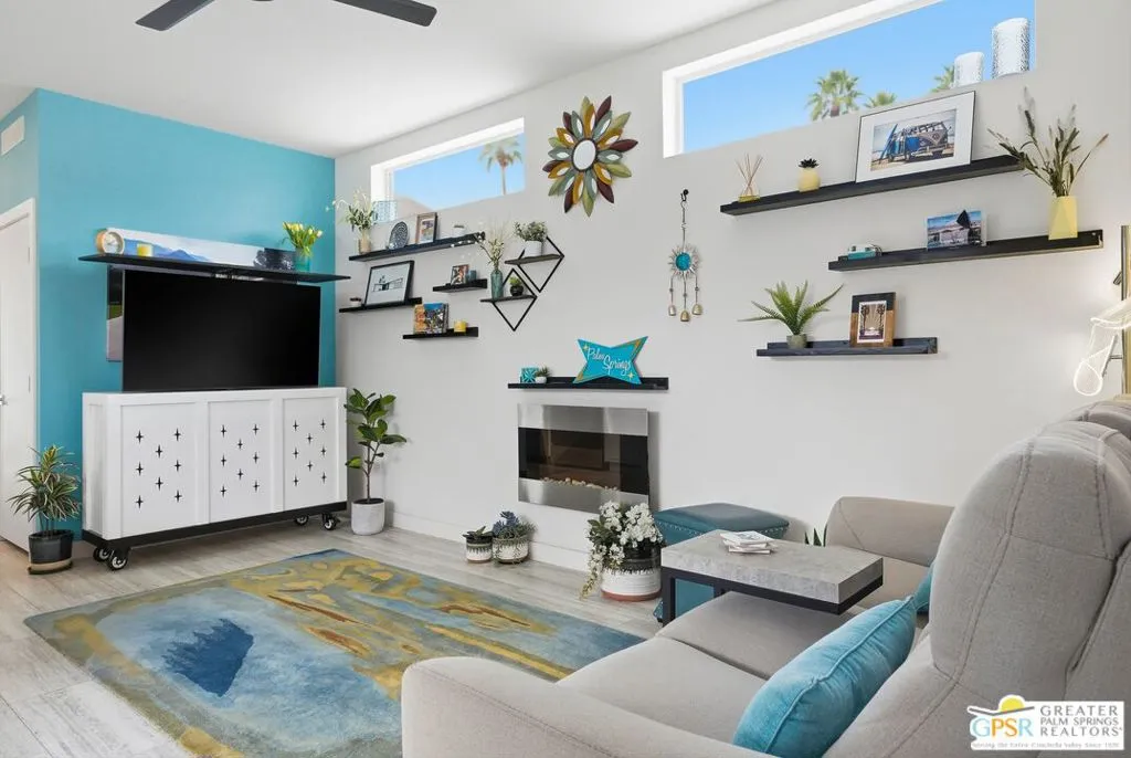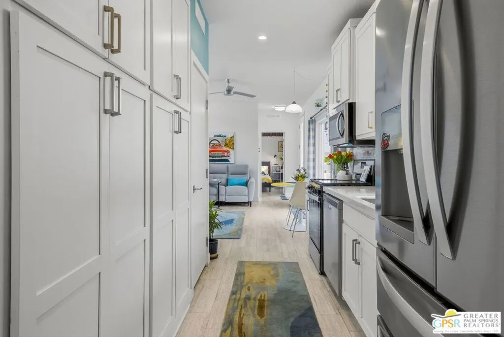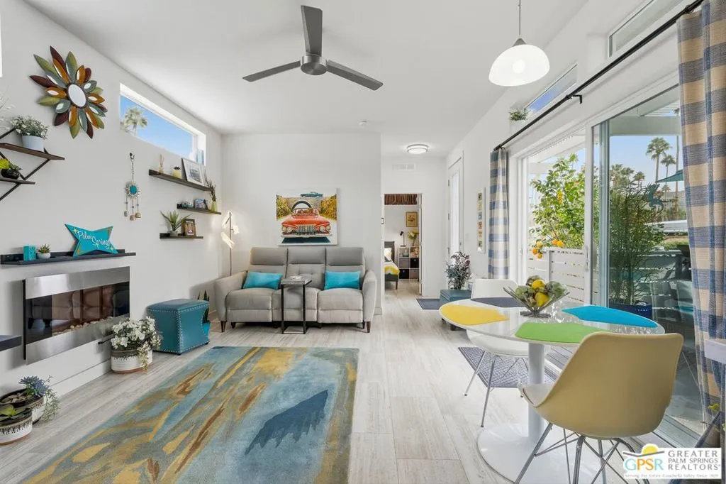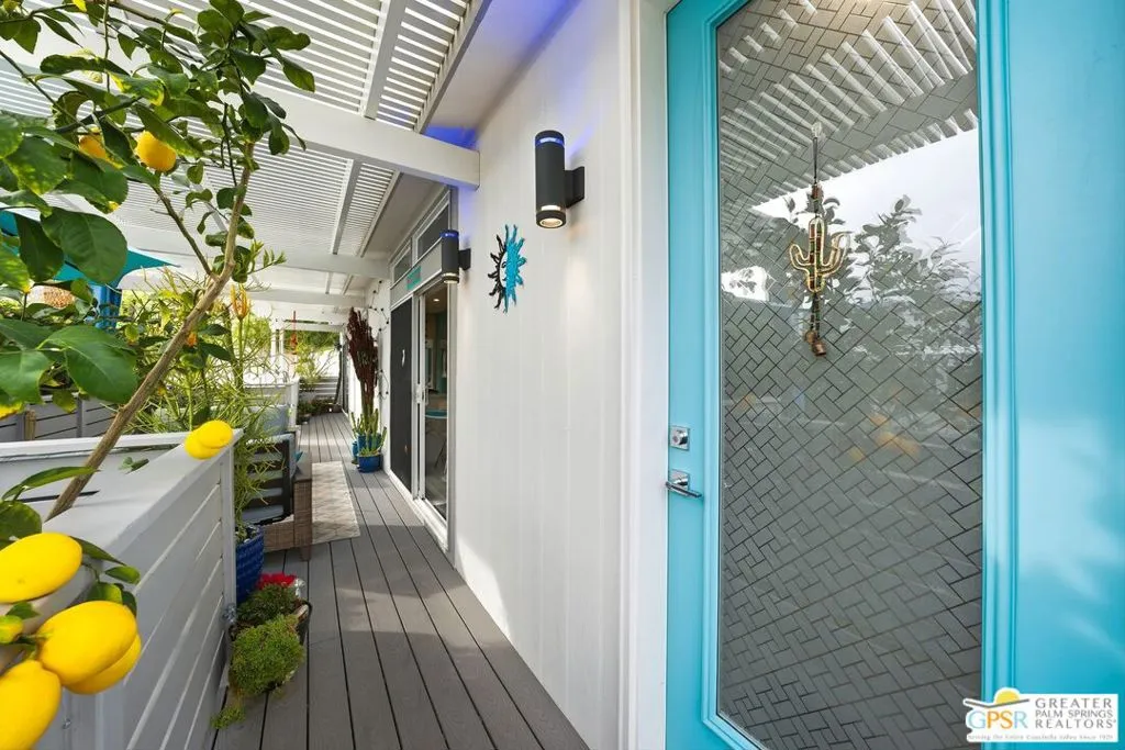 Located on a quiet street within the iconic Palm Springs Mobile Club, this thoughtfully landscaped home offers privacy without compromising spectacular mountain views. Leaning into the sought after mid-century modern design, the home delivers bright, efficient, low-maintenance desert living. Highlights include soaring 9-foot ceilings and clerestory windows that flood the space with natural light. The well-appointed galley kitchen is both stylish and functional. The primary suite features mirrored closets, an ensuite bath with a walk-in shower, and direct access to the outdoors. An expansive extended deck invites seamless indoor-outdoor living ideal for hosting or just relaxing under the desert sky. The fully enclosed yard is thoughtfully designed with outdoor curtains for year-round sun control and raised garden containers for effortless desert gardening, a perfect space for both entertaining and pampered pets. Offered turn-key furnished, this home is move-in ready. Palm Springs Mobile Club is a vibrant and welcoming community rich in amenities, including two dog parks, a pool and spa, fitness center, a clubhouse with dance hall and game room, billiards, shuffleboard, BBQ area, and fire pit, all embracing an exceptional Palm Springs lifestyle.