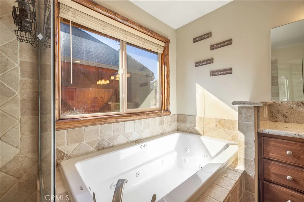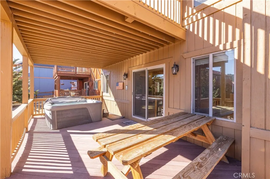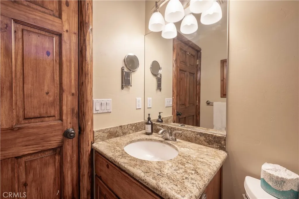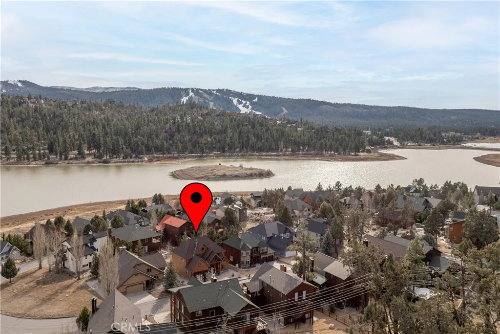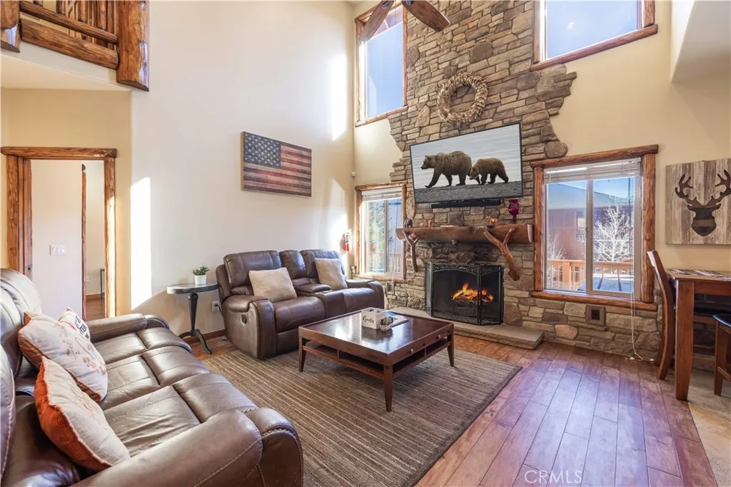 Custom log-style mountain home on Bear Loop with sweeping views of Baker’s Pond, the ski slopes, and Sugarloaf Mountain. This 4-bedroom, 4-bath residence features two true primary suites—one on each level—ideal for hosting, multi-generational living, or STR flexibility. The lodge-inspired living room showcases vaulted ceilings, a dramatic two-story rock fireplace, and an open catwalk loft, all framed by oversized windows and rich log and stone accents that deliver a true mountain feel. The open kitchen offers custom cabinetry, expansive granite countertops, and newer stainless steel appliances, flowing seamlessly into a spacious game room and dining area. Upstairs, the primary suite includes a walk-in closet, private balcony, and a spa-style bath with travertine finishes and soaking tub. Every bedroom features its own accent wall, adding warmth and character throughout. Dual forced-air heating zones serve both upper and lower levels for year-round comfort. Multiple decks invite you outdoors to take in the views, unwind in the new spa, and enjoy mountain living at its best. Located in a neighborhood with underground utilities and pride of ownership throughout. Minutes to everywhere you'd want to be in Big Bear!
