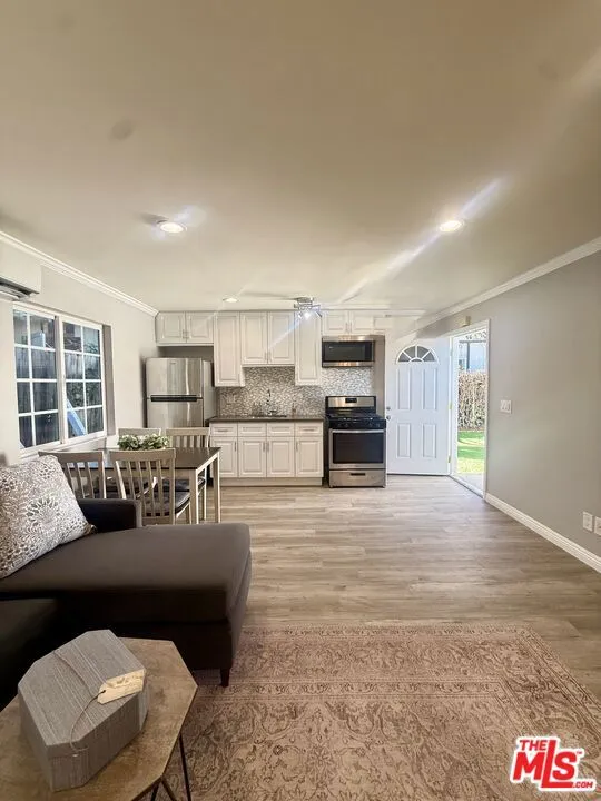 Completely remodeled, detached guest home/studio set in a secure, lushly landscaped setting with a private walkway and private yard. Ideally located a short distance to Trader Joe's, shops, and restaurants, and just one mile north of Ventura Blvd, offering easy access to the Westside and nearby studios. This upgraded, detached guest studio features a bright, fully furnished and functional living space with stainless steel appliances, granite countertops, and in-unit stackable laundry. A private front gate opens to a fully fenced backyard, offering ample space for a pet and outdoor relaxation. The unit comes fully furnished with a queen bed, dining table with four chairs, sectional sofa with pull-out bed, and all appliances included, including laundry and outdoor furniture. Tenant is responsible for utilities; the owner covers water. Ample street parking available. Note: the main residence is located at the front of the property on the same lot. Please click and view video tour.