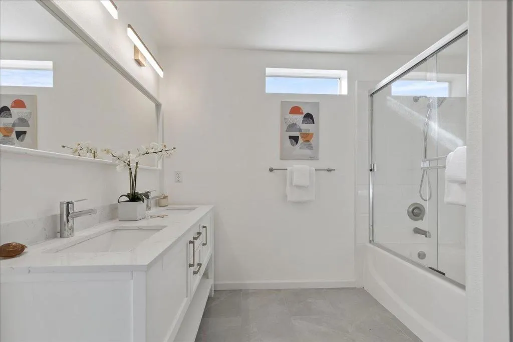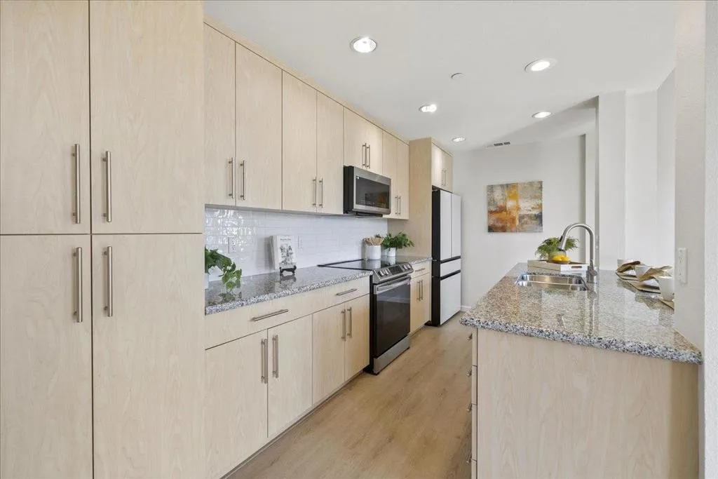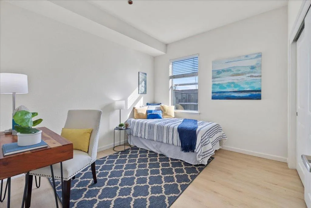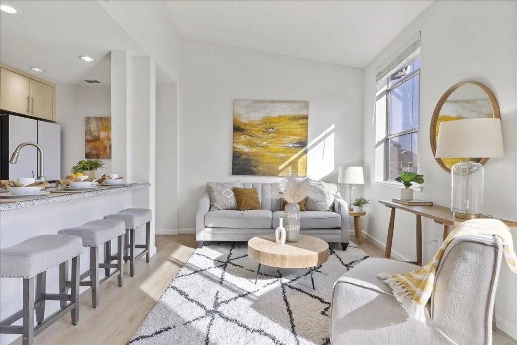 TOP-FLOOR CORNER RETREAT - A RARE FIND! This beautifully updated, light-filled gem with surprising Serenity & Privacy showcases an open living space with a beautiful ISLAND perfect for entertaining guests & family. The sun-drenched living space with CATHEDRAL CEILING & PATIO is elevated by a designer statement Nelson Saucer Bubble Pendant, while both bathrooms shine with stylish modern upgrades, including an elegant Artemide Tolomeo Wall Lamp. SHARES ONLY ONE WALL with a neighbor, offering EXCEPTIONAL PRIVACY. The primary suite comes with a WALK-IN CLOSET, DOUBLE SINKS, and an OVERSIZED SOAKING TUB. Set within a charming BOUTIQUE COMMUNITY of ONLY 34 RESIDENCES, this home offers a rare blend of style, space, and exclusivity. Walking distance to SEVEN SEAS PARK, VTA, and GROCERY OUTLET. EASY ACCESS to Hwy 101 & 237 and major tech employers. Complete with 1-CAR ATTACHED GARAGE, 2nd DESIGNATED PARKING SPACE, STORAGE CLOSET, AMPLE GUEST PARKING & STREET PARKING. Don't miss this rare opportunity to own a home that truly offers lifestyle and pride of ownership!