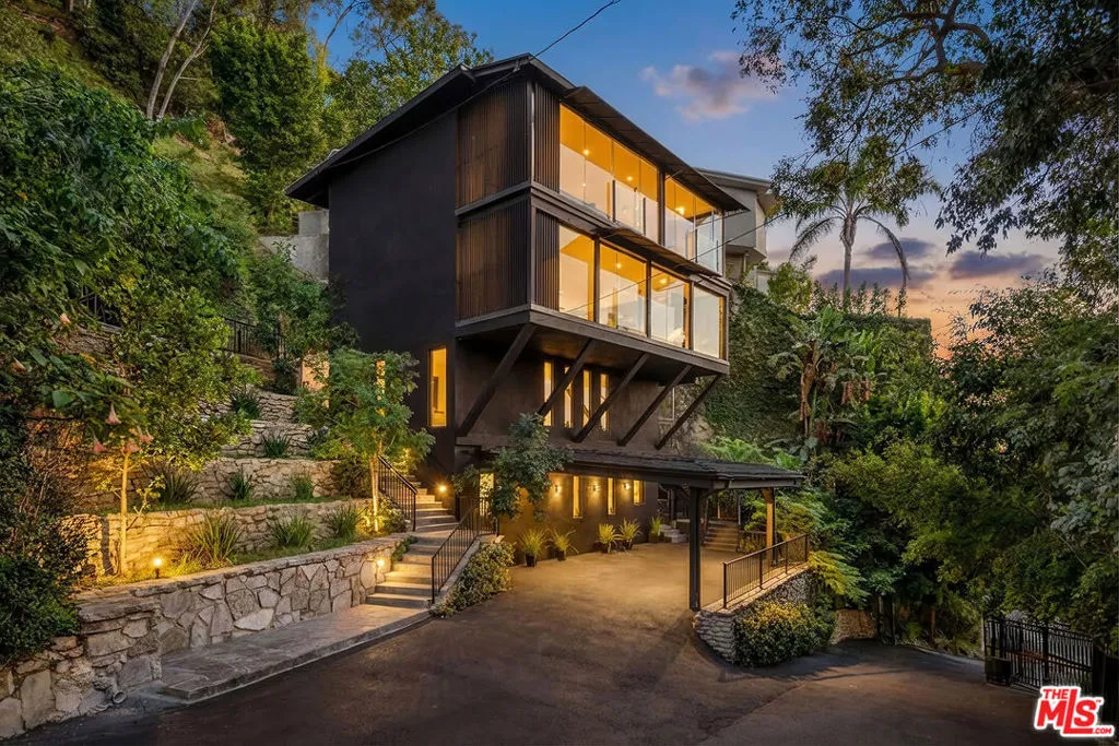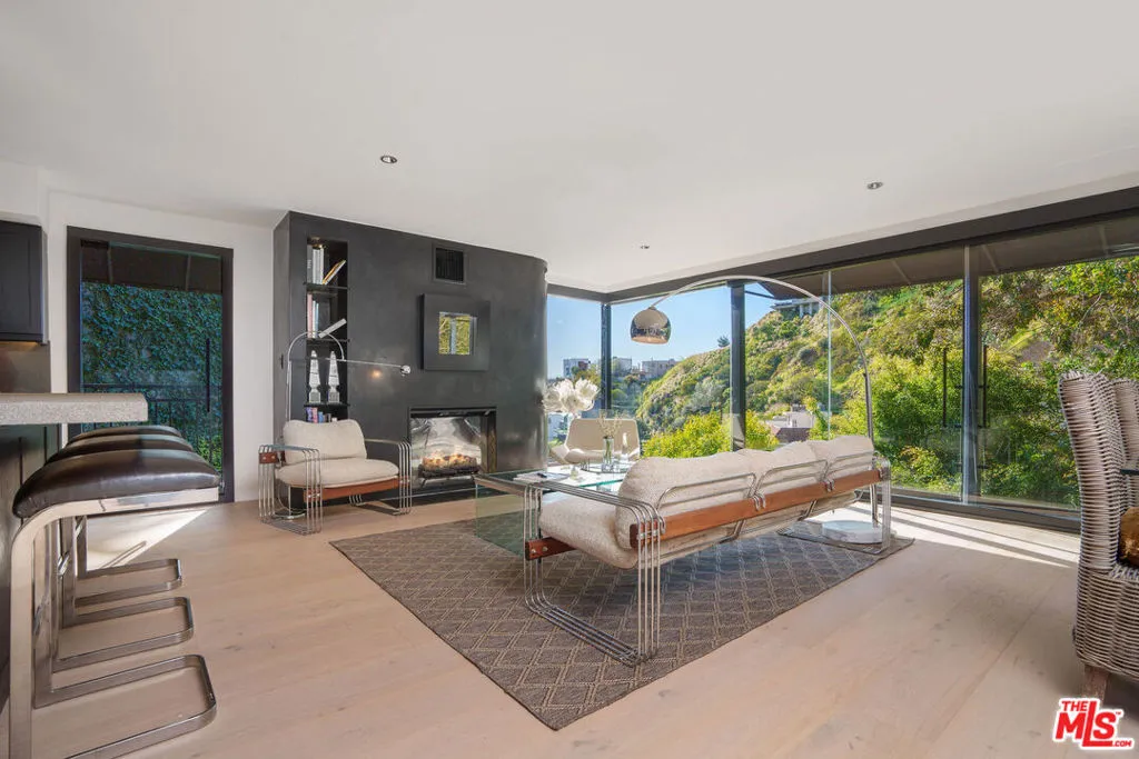 Gated, Floor to Ceiling, Glass-Wrapped Architectural Sanctuary with City and Ocean Views, Rare Outdoor Living Above Sunset Plaza! Floating high above Sunset Plaza, this newly reimagined, iconic architectural, 2 primary suite, 4 bath, plus permitted Junior ADU, residence by Roger Davis is a rare expression of glass, light, and elevated living in the Hollywood Hills. Privately gated, with 2+ parking and set beyond a dramatic arrival, inside, the architecture unfolds with intention. Wide-plank floors guide you through expansive living spaces wrapped in floor to ceiling glass, capturing breathtaking city lights and ocean views that shift beautifully from sunlit days to glittering nights. A striking glass staircase serves as a sculptural centerpiece, allowing natural light to flow effortlessly between levels and enhancing the home's airy, gallery-like feel. The newly remodeled open kitchen blends refined design with modern functionality, perfectly positioned for elevated entertaining and everyday living. The main residence features two full, large primary suites, each conceived as a private sanctuary with walk-in closets, spa-inspired baths, and dramatic walls of glass framing the skyline. Washer/dryer hookups on every level add an uncommon layer of comfort and convenience. What truly distinguishes this home is its exceptional outdoor living, a rarity in the Hollywood Hills. A large, grassy, flat yard, with additional outdoor seating areas, and a private balcony create a resort-like setting ideal for entertaining, lounging, or quiet moments above the city. An attached junior ADU with its own private entrance, bedroom, and bathroom offers remarkable flexibility for guests, creative use, or income potential, all while remaining seamlessly integrated into the architecture. Bold, refined, and unmistakably iconic, this Roger Davis creation is more than a home, it is a statement of design, privacy, and elevated Los Angeles living. A must see!