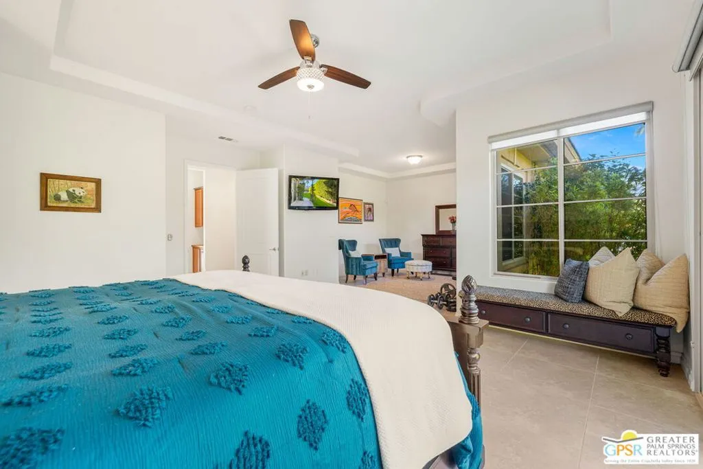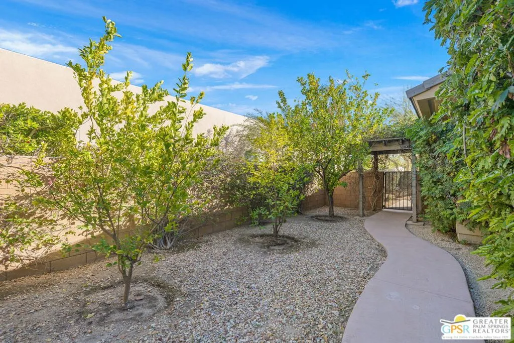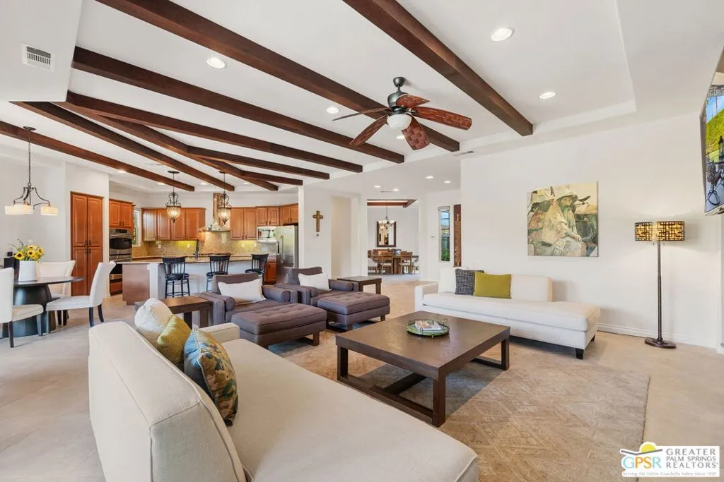 Enclave at Sunrise, an intimate private cul-de-sac of only 52 homes, this Residence Plan Two, completed in 2013 delivers refined Palm Springs living with privacy, scale, and Mountain views. The interior is bright and architectural with soaring beamed ceilings, designer lighting, tile floors throughout, and expansive glass sliders creating a seamless indoor-outdoor connection. A formal dining space anchors the layout and flows naturally into the main living areas. The kitchen is both functional and elegant, featuring rich wood cabinetry, granite countertops, stainless steel appliances, double ovens, and a large prep island. It opens to a dining area and a spacious great room centered around a fireplace. The primary suite is a private retreat with a sitting area, and a spa inspired bath offering marble countertops, dual sinks, soaking tub, separate shower, and a generous walk-in closet. A well-appointed en-suite guest bedroom provides comfort and privacy. An attached private casita with its own entrance offers flexible use for guests or a quiet home office. The backyard is designed for resort style living with a covered patio, gas fireplace, built in BBQ, retractable awning, and a pool with tanning shelf and spa. Mature landscaping, lawn areas, and tall ficus hedges create exceptional privacy, while a gated side yard with trellis detail adds both form and function. Elegant, understated, and thoughtfully designed, this home offers a Quiet Luxury Lifestyle in one of Palm Springs' most desirable enclaves.