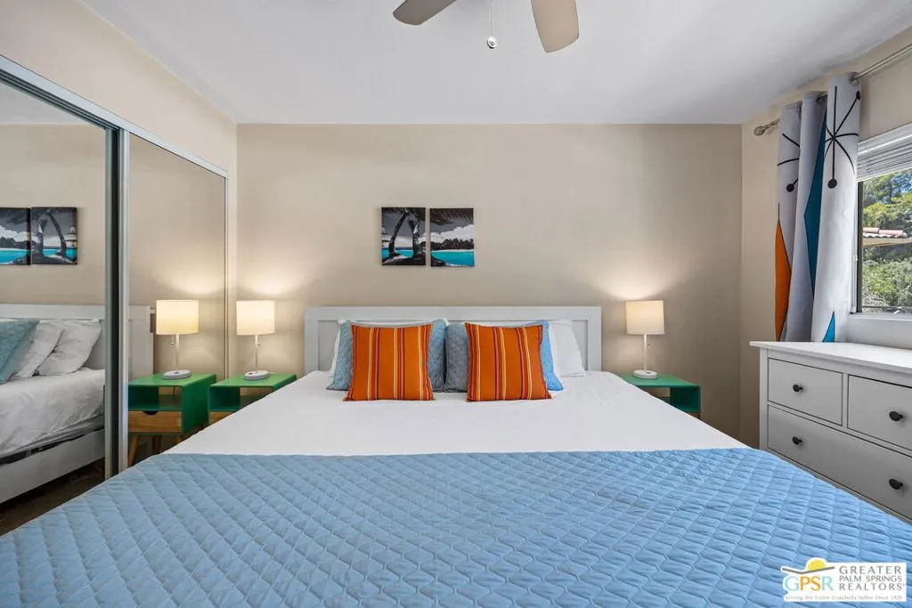Welcome to your new oasis at 575 N Villa Ct #204 in the heart of beautiful Palm Springs! This charming and inviting unit is ideal for those seeking a long-term residence in a vibrant and serene environment. Thoughtfully furnished for your convenience to perfectly match your personal style and needs. As you step inside, you'll be greeted by a modern and upbeat living room, designed to perfectly capture the essence of Palm Springs' indoor-outdoor lifestyle. The West-facing doors and windows flood the space with natural light, creating a bright and cheerful ambiance. The master bedroom boasts a plush queen-sized bed, while the living room features a pull-out queen bed, offering comfortable accommodation for up to four guests in the cool, air-conditioned spaces. Your private balcony is a tranquil retreat, complete with a cafe table and breathtaking views of the mountains to the West and the iconic windmills to the North. For those moments when you seek additional relaxation, take a leisurely stroll to one of the community's four heated pools, lounge under the sun, or enjoy a starlit evening in the hot tub. This gated and guarded community is a paradise of meticulously landscaped grounds, offering a wealth of amenities including jacuzzis, tennis courts, BBQs, a putting green, and shuffleboard. With so many activities and relaxing spots at your fingertips, you'll find endless ways to enjoy your time here. Don't miss out on the chance to make this wonderful space your new home. Contact us today to schedule a viewing and embrace the unparalleled Palm Springs lifestyle!