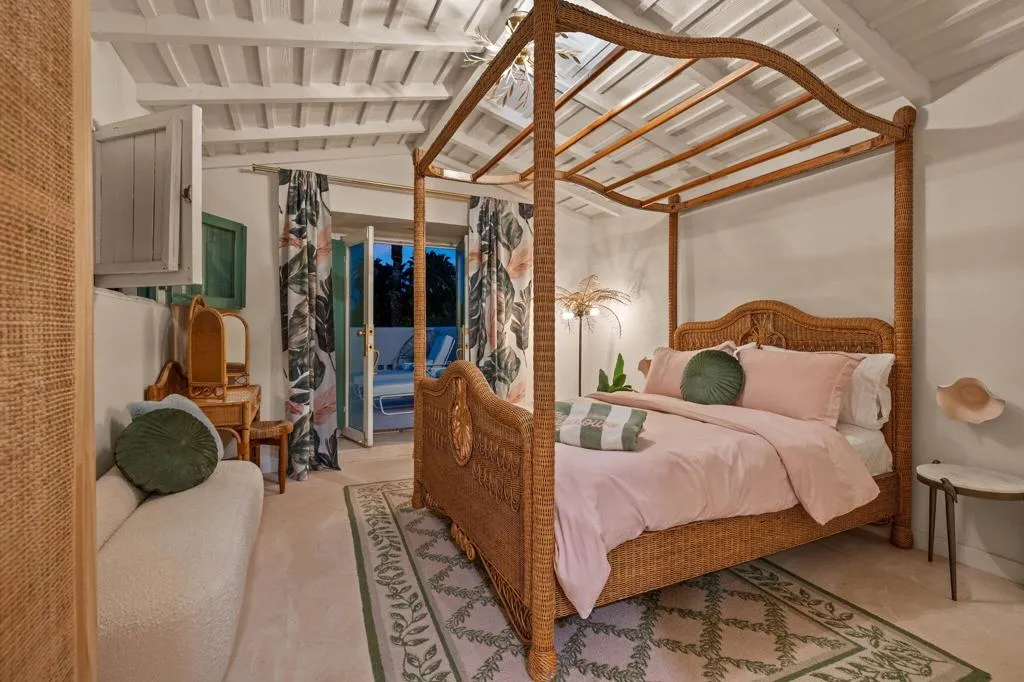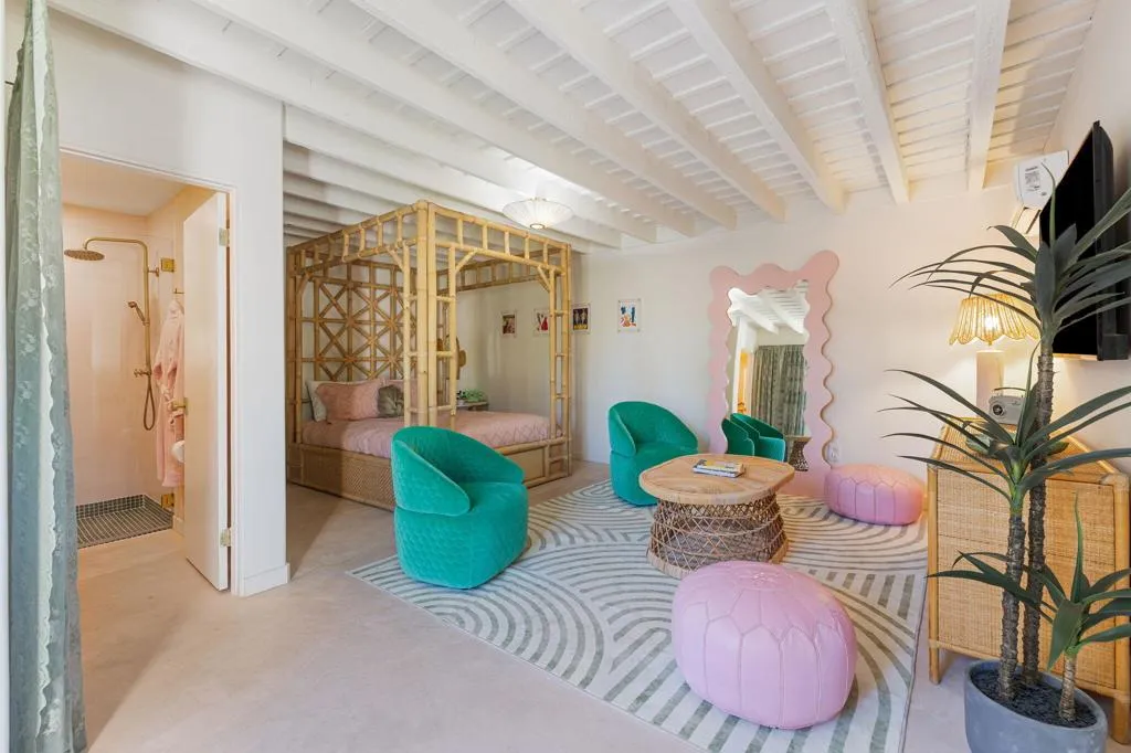 The Mesa Bungalows is a bold and iconic Palm Springs estate, privately gated and set in the coveted neighborhood of The Mesa in South Palm Springs. Originally built in 1937, this Spanish style villa was designed as both a showpiece and a resort-style retreat, with a vintage pink and green palette inspired by the Beverly Hills Hotel and Jayne Mansfield's iconic Pink Palace. The outdoor experience is nothing short of extraordinary--featuring a custom putting green, a pink kidney-shaped pool and spa with a cascading rock waterfall, an ornate gazebo, and water fountain. An upper level entertaining space showcases a built-in BBQ, fireplace, and a daybed shaded by large pink metal palm fronds. Inside, the home continues its unapologetically chic aesthetic with a fully curated pink interior. The kitchen is outfitted with statement-making Smeg appliances and bold pink quartz countertops, blending playful glamour with modern sophistication. Four separate en-suite bedrooms sprawl the two levels of the home, including one with its own private sun deck overlooking the property. Every detail has been carefully considered to celebrate color, design, and the indoor-outdoor lifestyle Palm Springs is known for. Striking, expressive, and undeniably exclusive, Mesa Bungalows is not just a home--it's a destination, a statement, and a true Palm Springs original perfect for short-term rentals or a private getaway. Schedule your tour today!