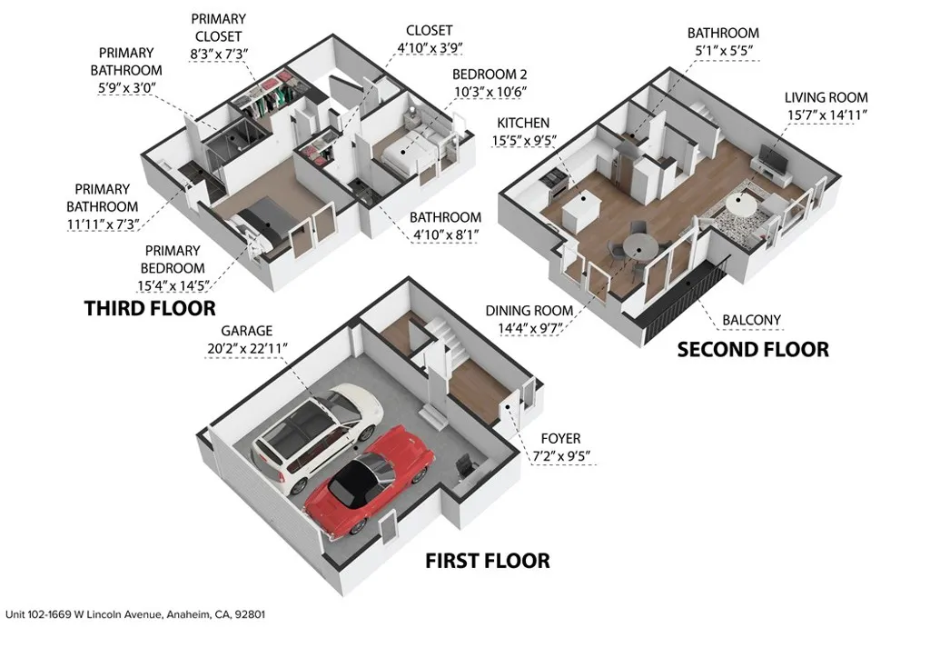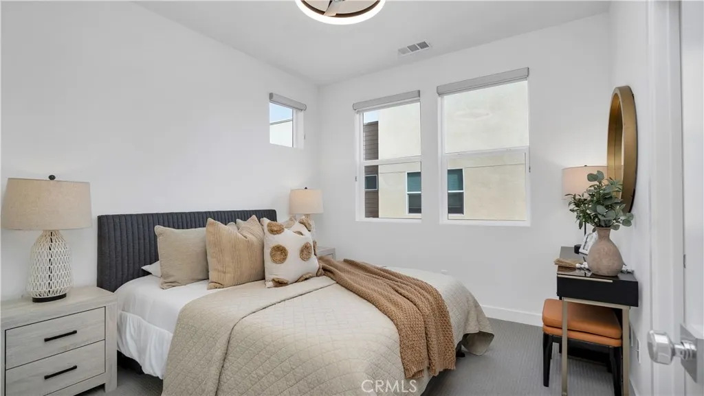 Welcome to 1669 W Lincoln Ave, a pristine tri-level condo built in 2024 and barely lived in, offering a modern, turnkey lifestyle in Anaheim’s highly desirable Emerald Pointe community. Designed for today’s discerning buyer, this home blends contemporary style with functional living. The second floor serves as the main living area and features an open-concept floor plan flooded with natural light through large windows, creating a bright, airy, and inviting atmosphere. The chef’s kitchen is a true centerpiece, boasting quartz countertops, stainless steel appliances, a large eat-in island, black custom backsplash, and chic pendant lighting. Step out from the dining area onto your private balcony ideal for morning coffee, evening relaxation, or entertaining guests. Upstairs, the luxurious primary suite offers a spa-inspired walk-in shower, dual vanities, and generous closet space, creating a serene retreat. The second bedroom enjoys its own private bathroom, perfect for guests or roommates. Premium luxury vinyl flooring flows throughout the main areas, while plush carpeting adds warmth and comfort to the bedrooms and stairs. Additional features include an attached two-car garage and the peace of mind that comes with living in a gated community. Residents enjoy resort-style amenities including a sparkling pool, spa, and beautifully landscaped green spaces, providing the perfect balance of relaxation and recreation. Conveniently located, this home is just minutes from Disneyland, Angel Stadium, the Honda Center, and major freeways, making travel across Orange County effortless. Trendy dining, shopping, and entertainment options are just moments away, giving you the vibrant lifestyle you crave. 1669 W Lincoln Ave offers modern, stylish living with resort-like amenities and an unbeatable location. With its light-filled spaces, high-end finishes, and thoughtful design, this home is a rare opportunity to enjoy comfort, luxury, and convenience all in one.