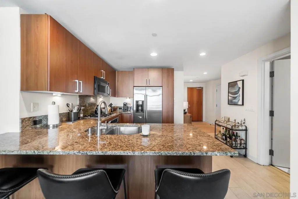 “The Mark” sets the standard for urban living in Downtown San Diego. Located just one block from Petco Park, the building offers a resort-style pool and spa, fitness center, conference room, and on-site management, maintenance, and security. A massive interior courtyard with BBQ and pizza oven completes the experience. Residence 504 features an open-concept layout with 11-foot ceilings, floor-to-ceiling windows, exposed concrete accents, waterproof vinyl flooring, and a private balcony showcasing striking views of the San Diego skyline. Just steps to the Gaslamp Quarter, Convention Center, and San Diego Bay. One large parking space and an oversized 8’ x 7’ storage room are included.