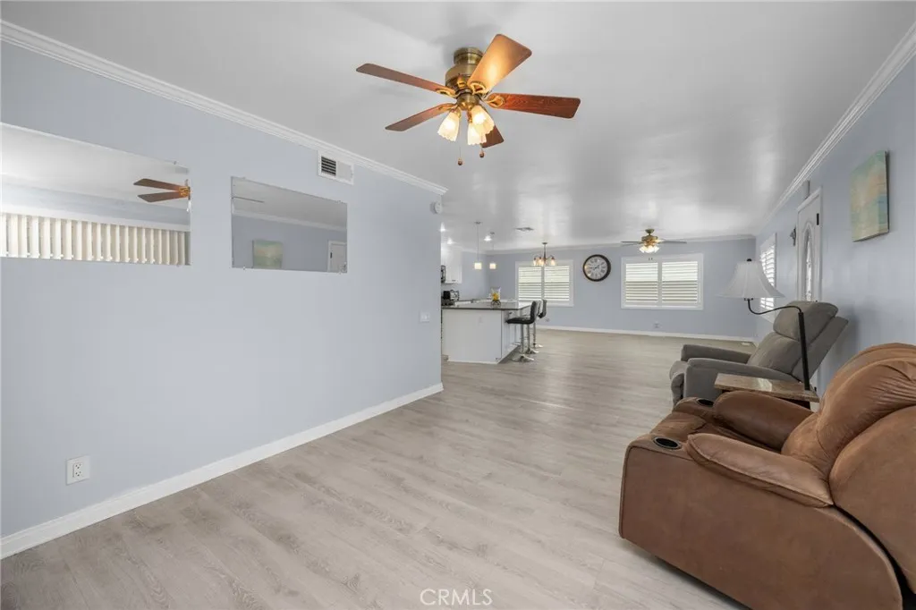 Treat yourself by visiting this Lovely Home. A Great location and updated. Not only is this the Best Location, you feel as though you are in a Park setting on two sides. This Remodeled Home provides the Open Concept with a completely New Kitchen. Quartz Countertops, New wood self closing Cabinets. Two separate Ovens. Huge counter space including the open island. Plus it is open to the Family Room. Crown Molding and Base boards plus Wood Laminate Flooring through out. Carpet in the two Bedrooms. All new interior panel doors and two lovely Exterior entry Doors. The Sun room adds to the nice view of the Green Belt. This Home has it's own yard, large enough to enjoy your own landscape. The HVAC is New, also You will appreciate the Covered side by side Carport and large storage shed. Low Space Rent.